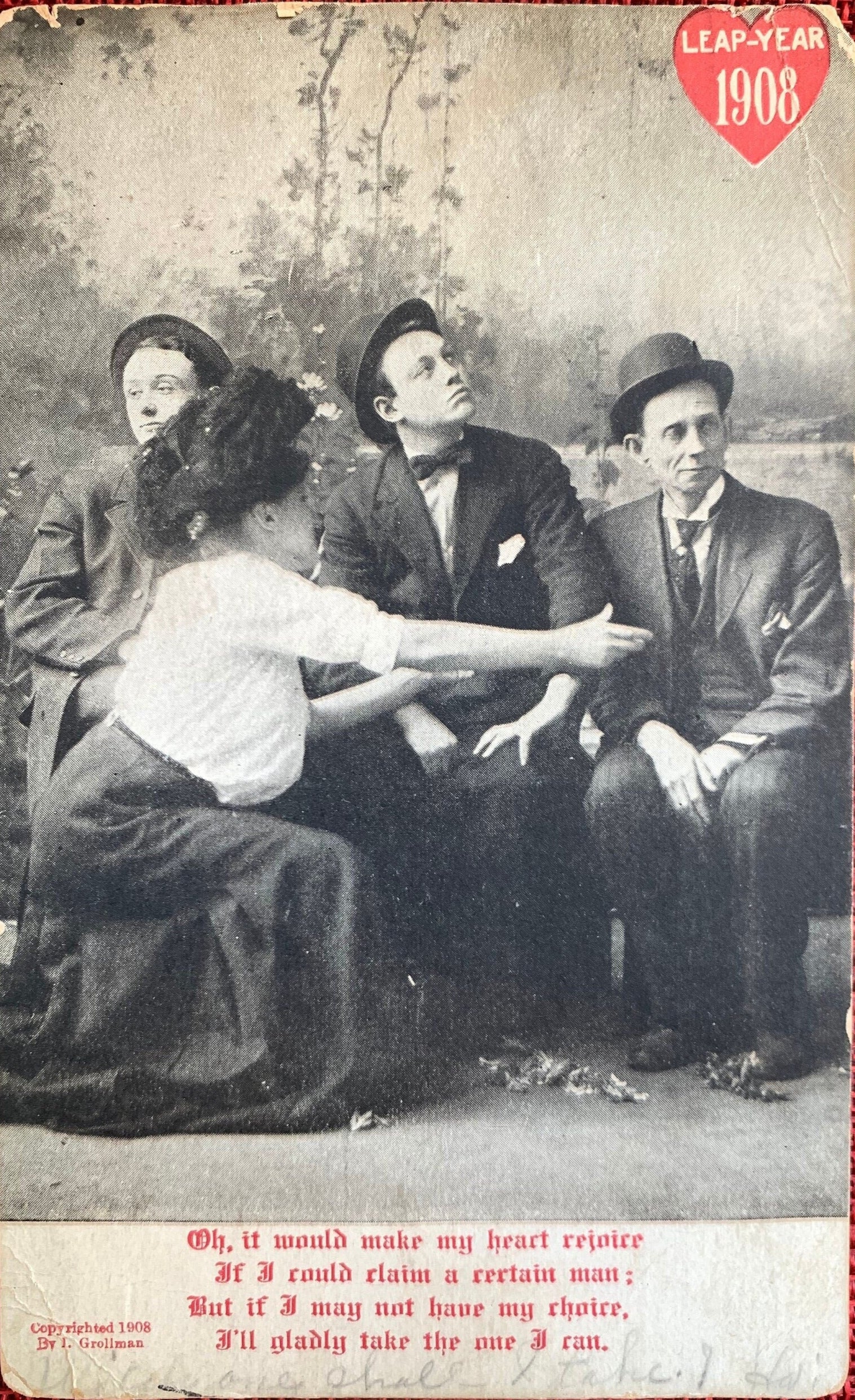 This linen postcard features a black and white photograph of a woman reaching for three different men who don't seem particularly interested in her. The front has a poem on it and below the last line of the poem the original sender wrote something in pencil, but after 100 years it is no longer clear.