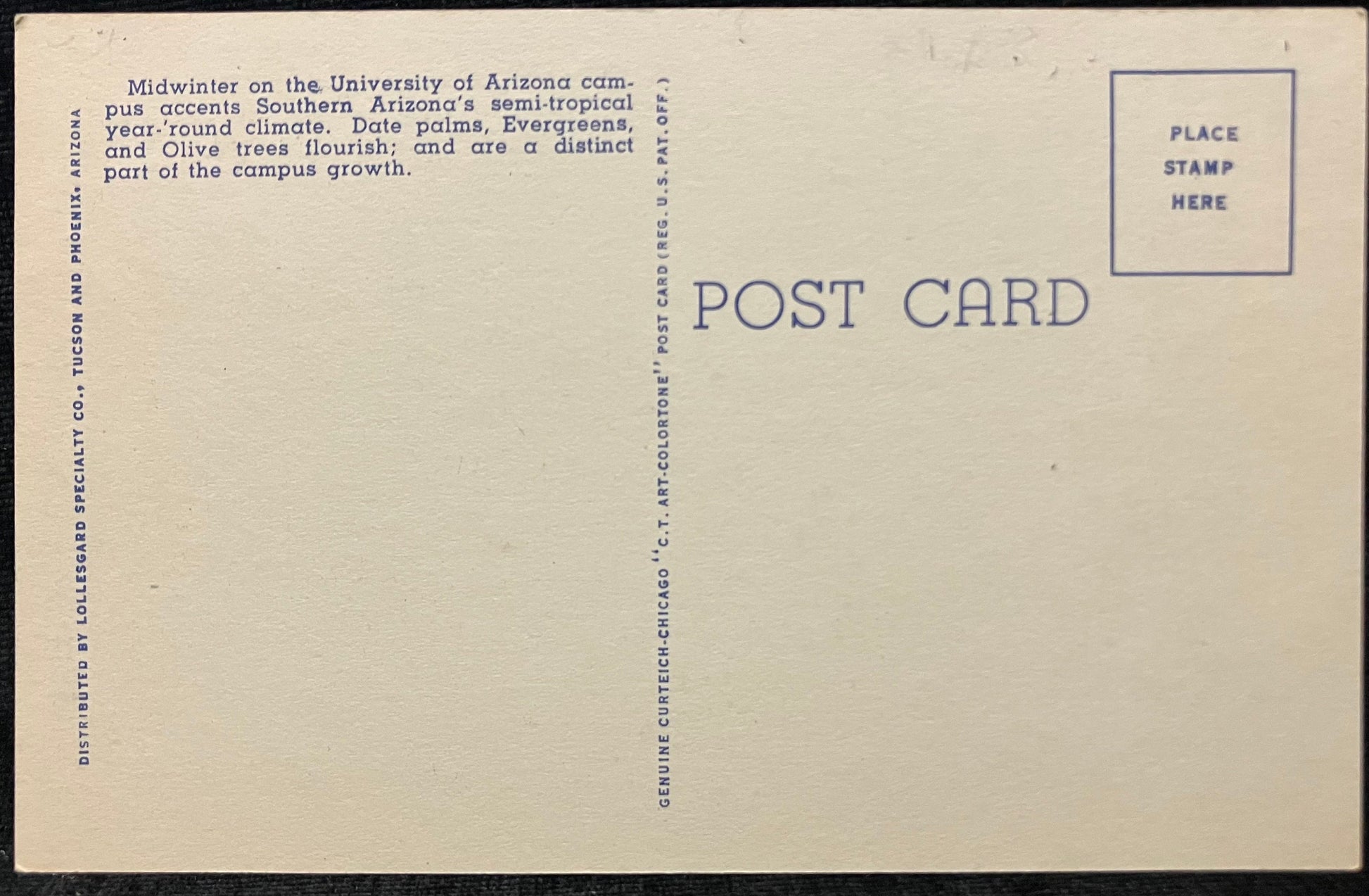 Back: Midwinter on the University of Arizona campus accents Southern Arizona’s semi-topical year-‘round climate. Date palms, Evergreeens, and Olive trees flourish; and are a distinct part of the campus growth.