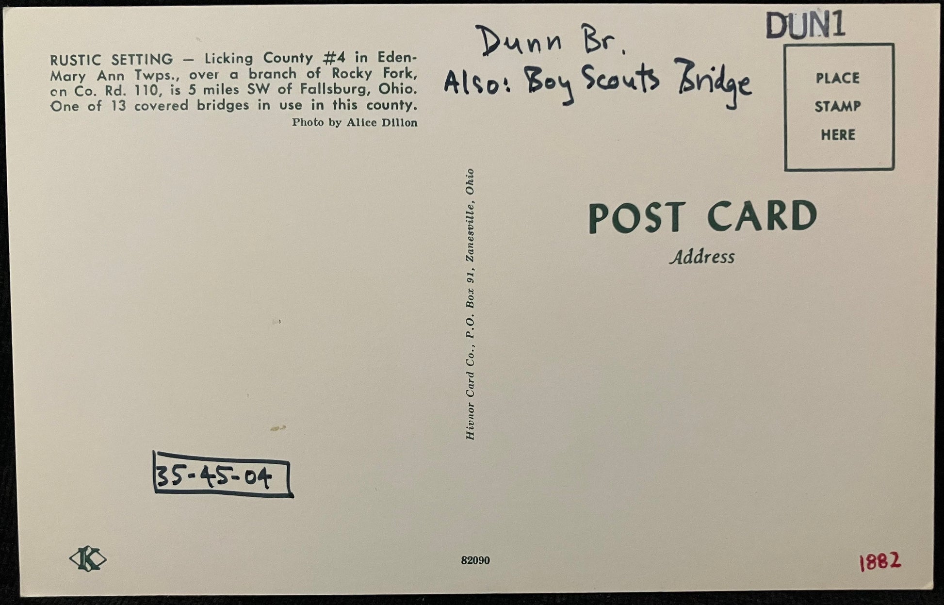 Licking County #4 Bridge in Eden-Mary Ann Twps. in Ohio - Dunn Bridge or Boy Scouts Bridge - Photo: Alice Dillon - Vintage Bridge Postcard
