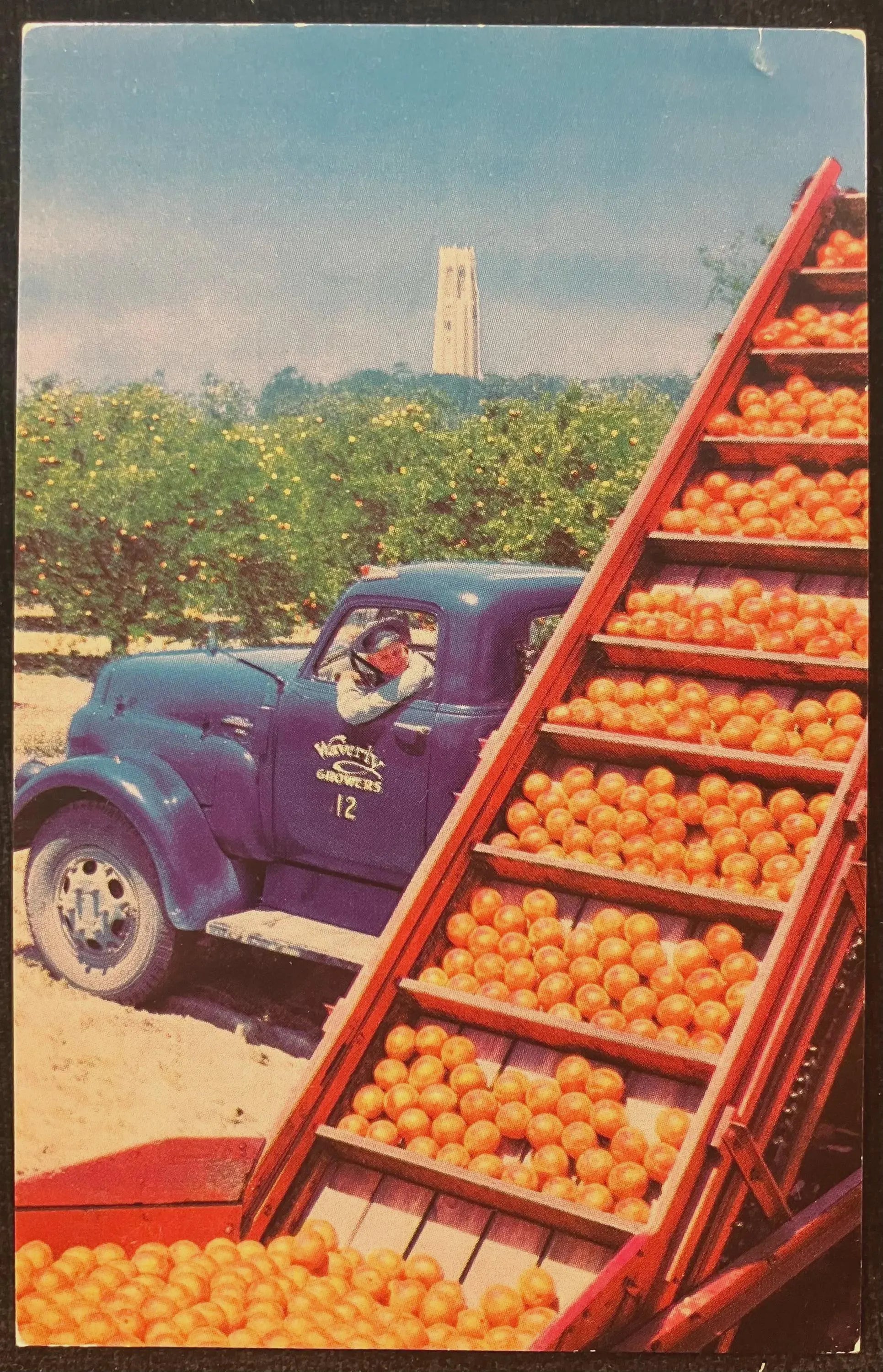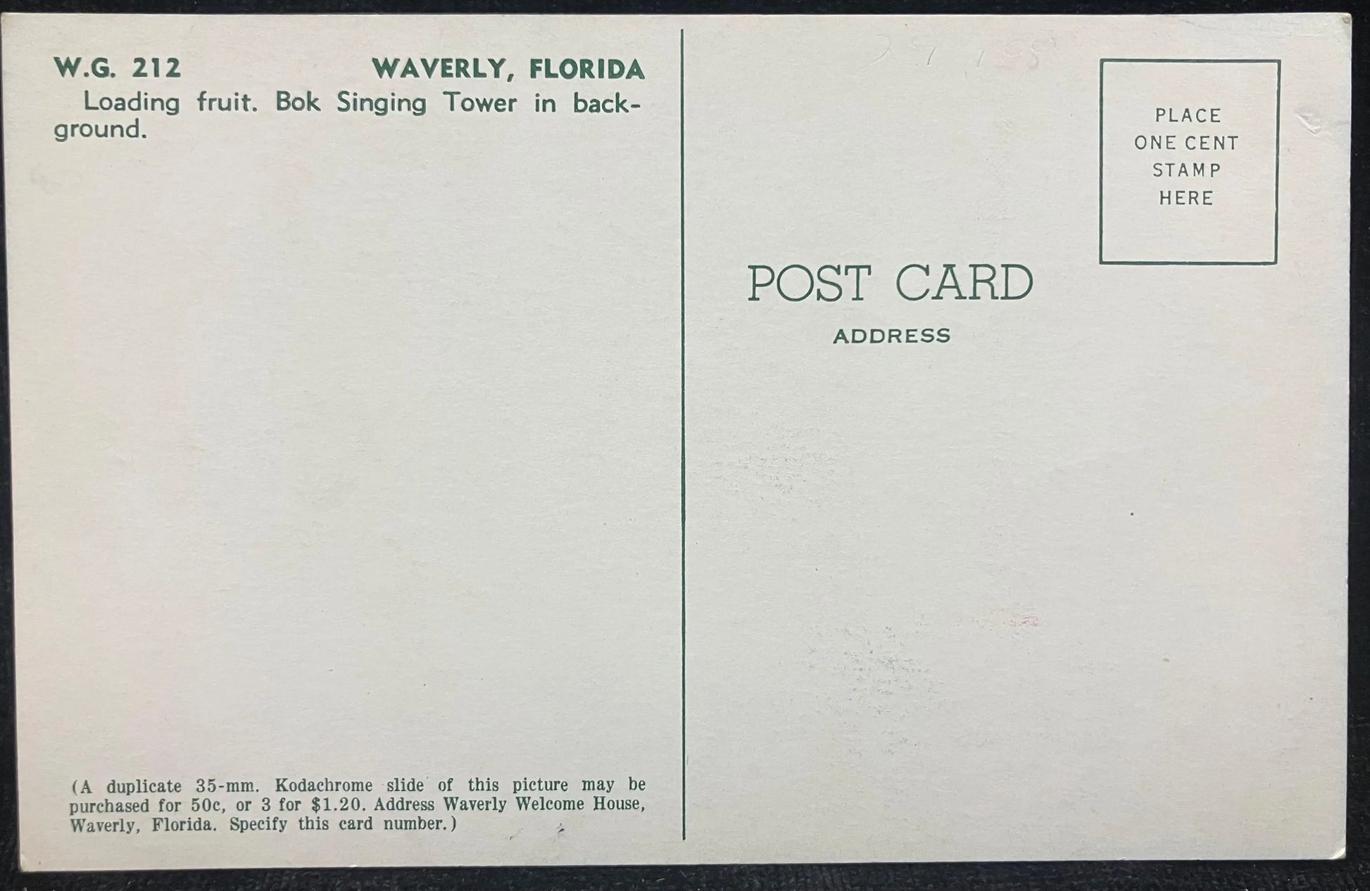 Back: WAVERLY FLORIDA Loading fruit. Bok Singing Tower in background. (A duplicate 35-mm. Kodachrome slide of this picture may b e purchased for 50c, or 3 for $1.20. Addresss Waverly Welcome House, Waverly Florida. Specify this card number.)
