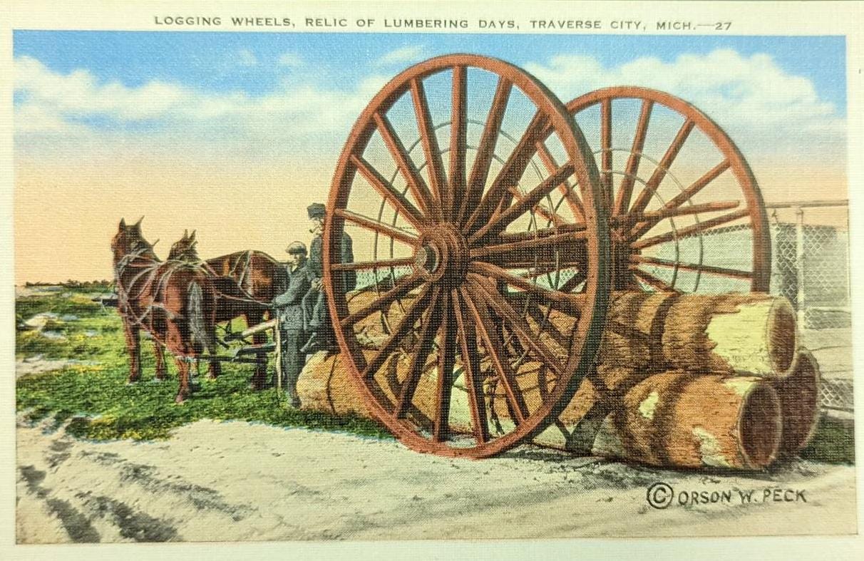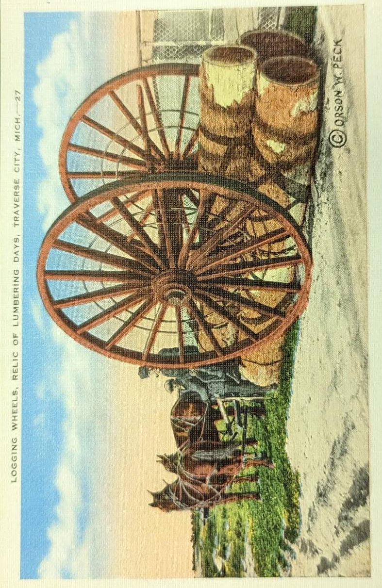 Logging Wheels - Relic of Lumbering Days - Traverse City, Michigan - 1940s Linen Postcard