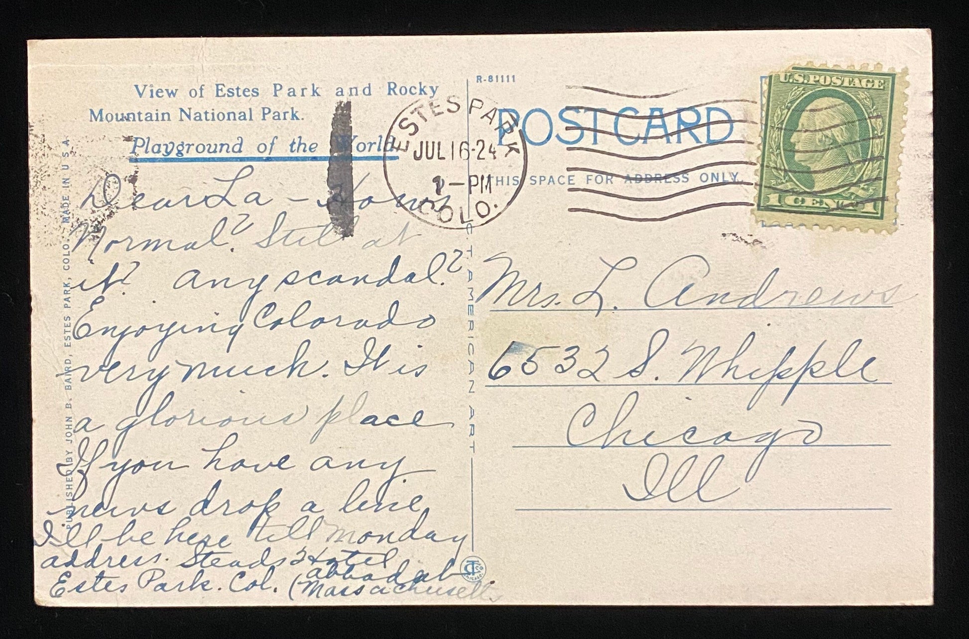 Back: "View of Estes Park and Rocky Mountain National Park. Playground of the World."