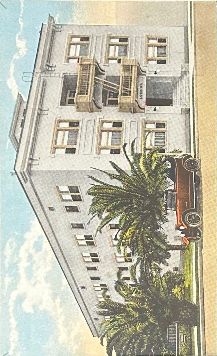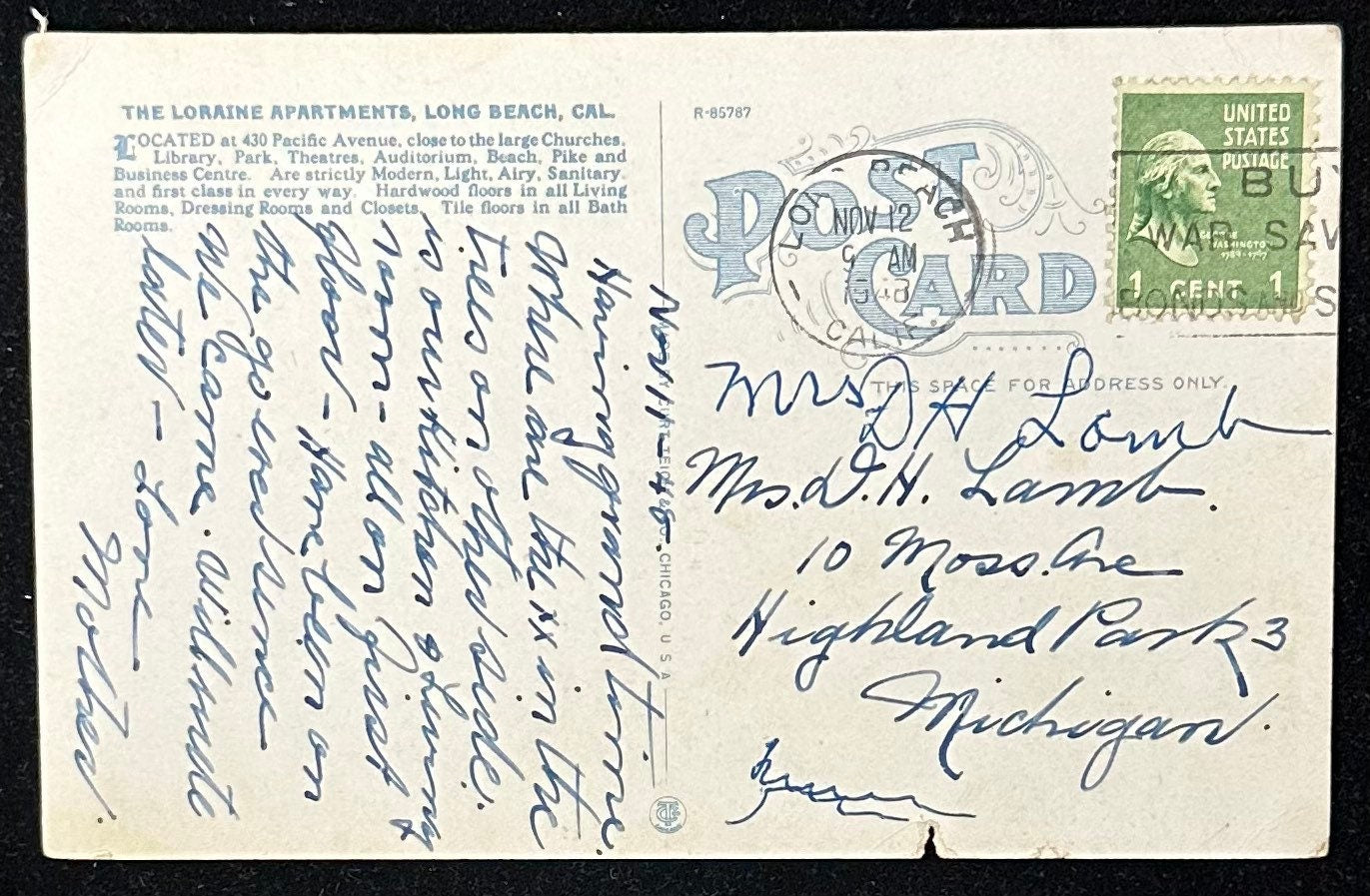 Back Information: The Loraine Apartments, Long Beach, Cal. - Located at 430 Pacific Avenue, close to the large Churches Library, Park ,Theatres (has a typo on the postcard), Auditorium, Beach, Pike and Business Centre. Are strictly Modern Light, Airy, Sanitary Rooms, Dressing Rooms and Closets. Tile floors in all bath Rooms.