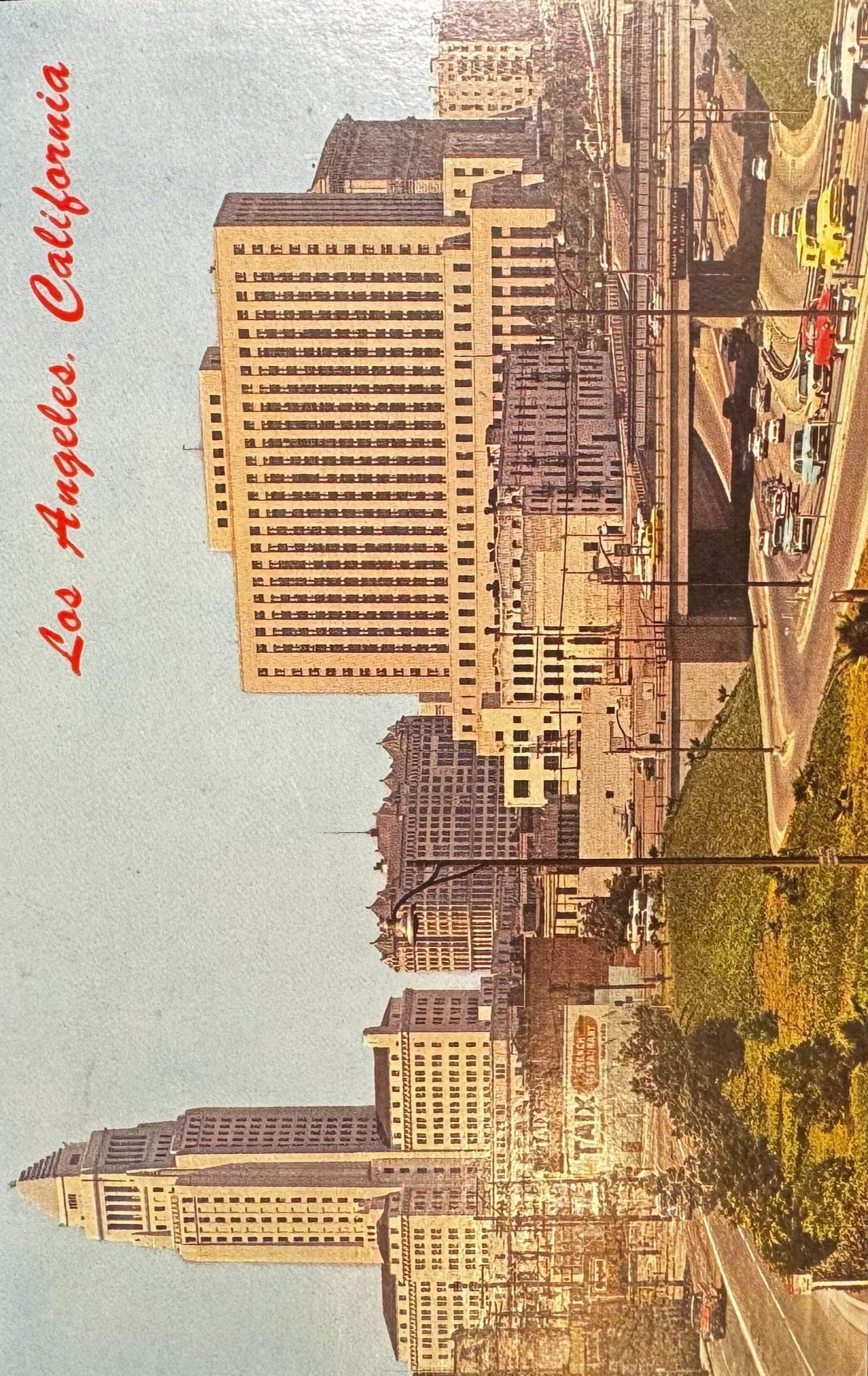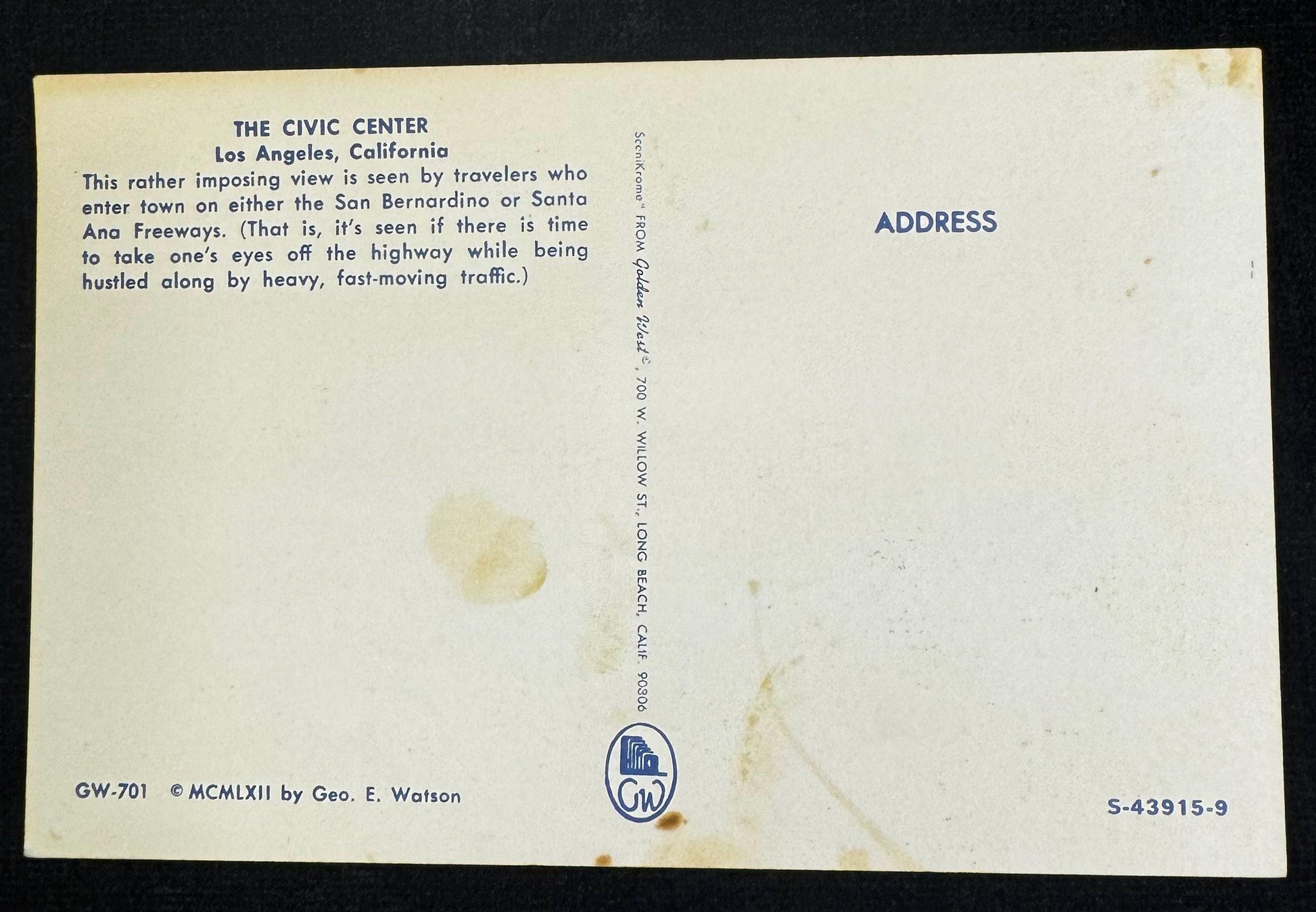 Back: The Civic Center | Los Angeles, California | This rather imposing view is seen by travelers who enter town on either of the San Bernardino or Santa Ana Freeways. (That is, it's seen if there is time to take one's eyes off the highway while being hustled along the heavy, fast-moving traffic.)