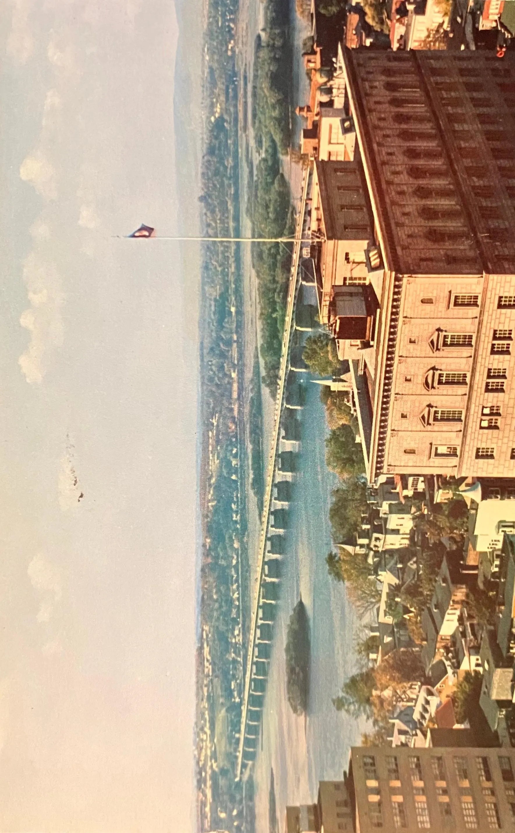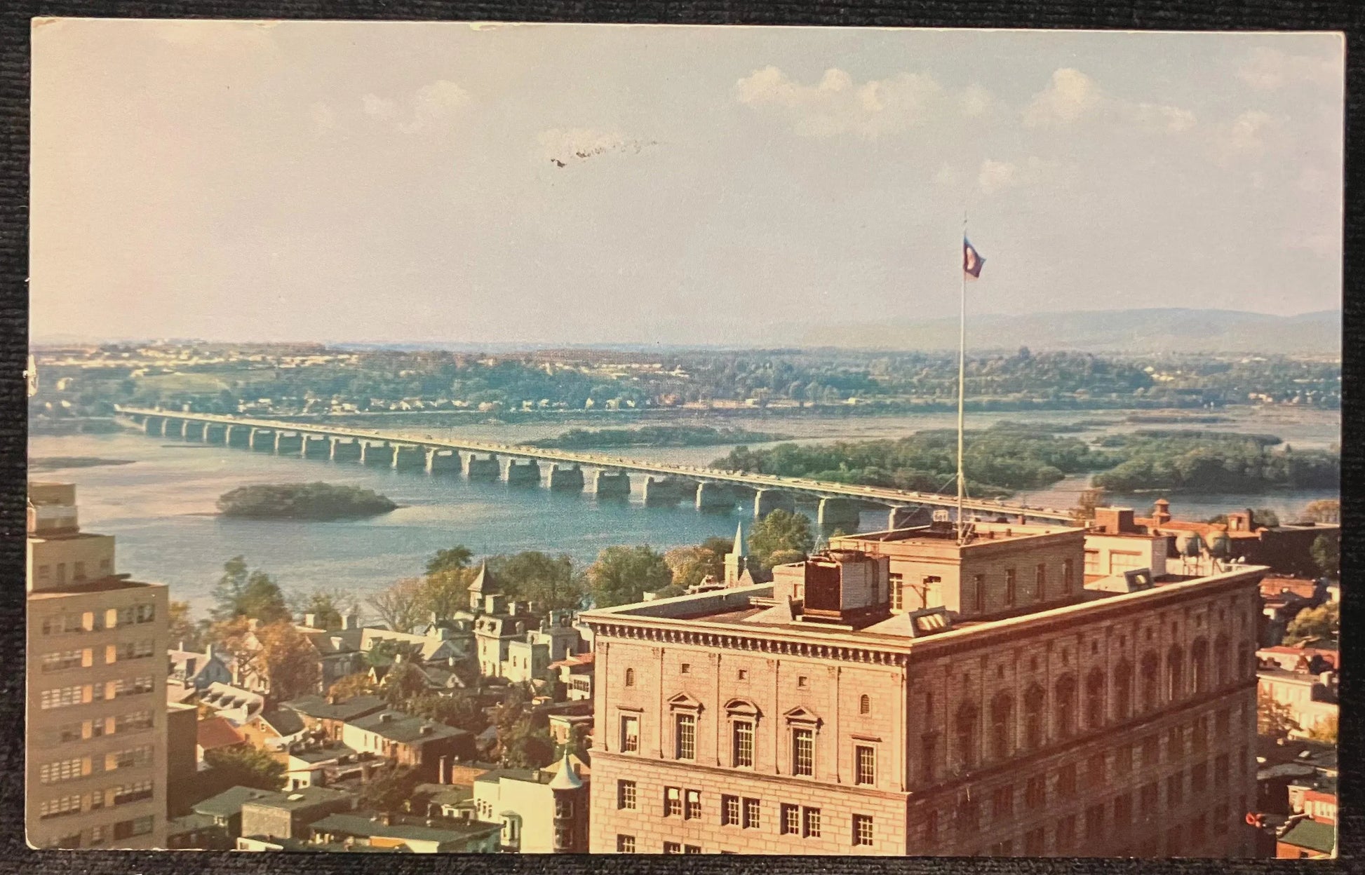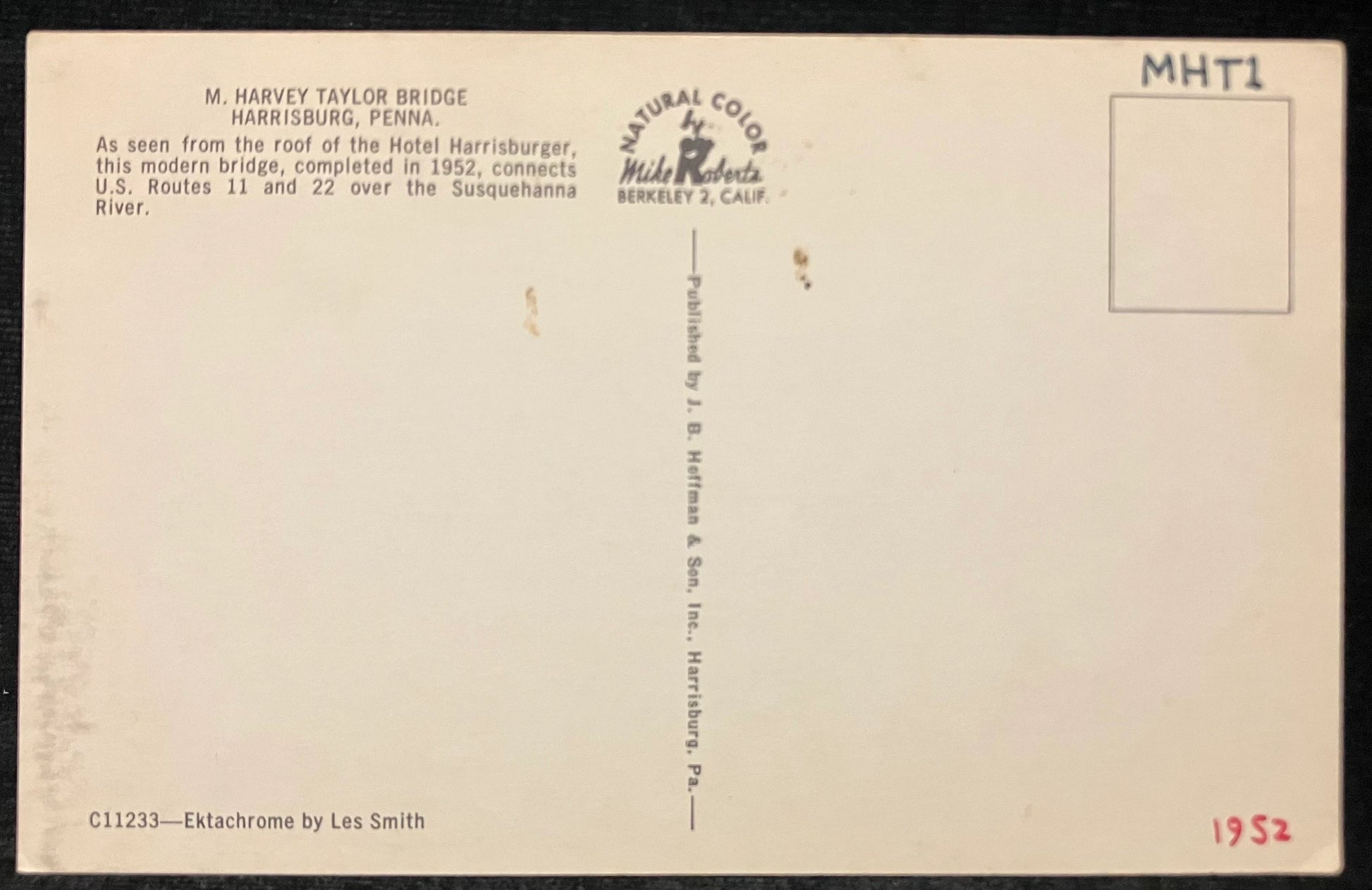 On back: M. Harvey Taylor Bridge Harrisburg, Penna. As seen from the roof of the Hotel Harrisburger, this modern bridge, completed in 1952, connects U.S. Routes 11 and 22 over the Susquehanna River. Ektachrome by Les Smith.
