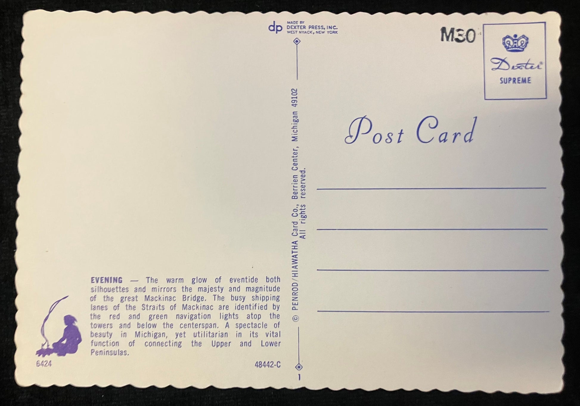 On back: Evening - The warm glow of eventide both silhouettes and mirrors, the majesty and magnitude of the great Mackinac Bridge. The busy shipping lanes of straits of Mackinac are identified by the red and green navigation lights a top the towers and below the center span. A spectacle of beauty in Michigan, yet utilitarian in its vital function of connecting the Upper and Lower Peninsulas.