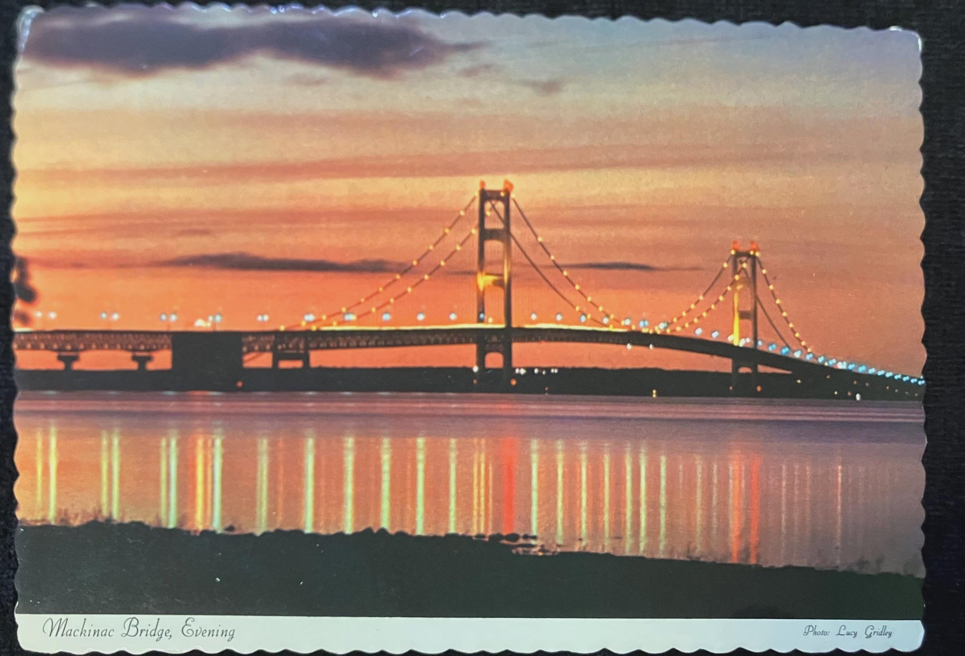 Mackinac Bridge, Evening - Photo by Lucy Gridley - Vintage Postcard