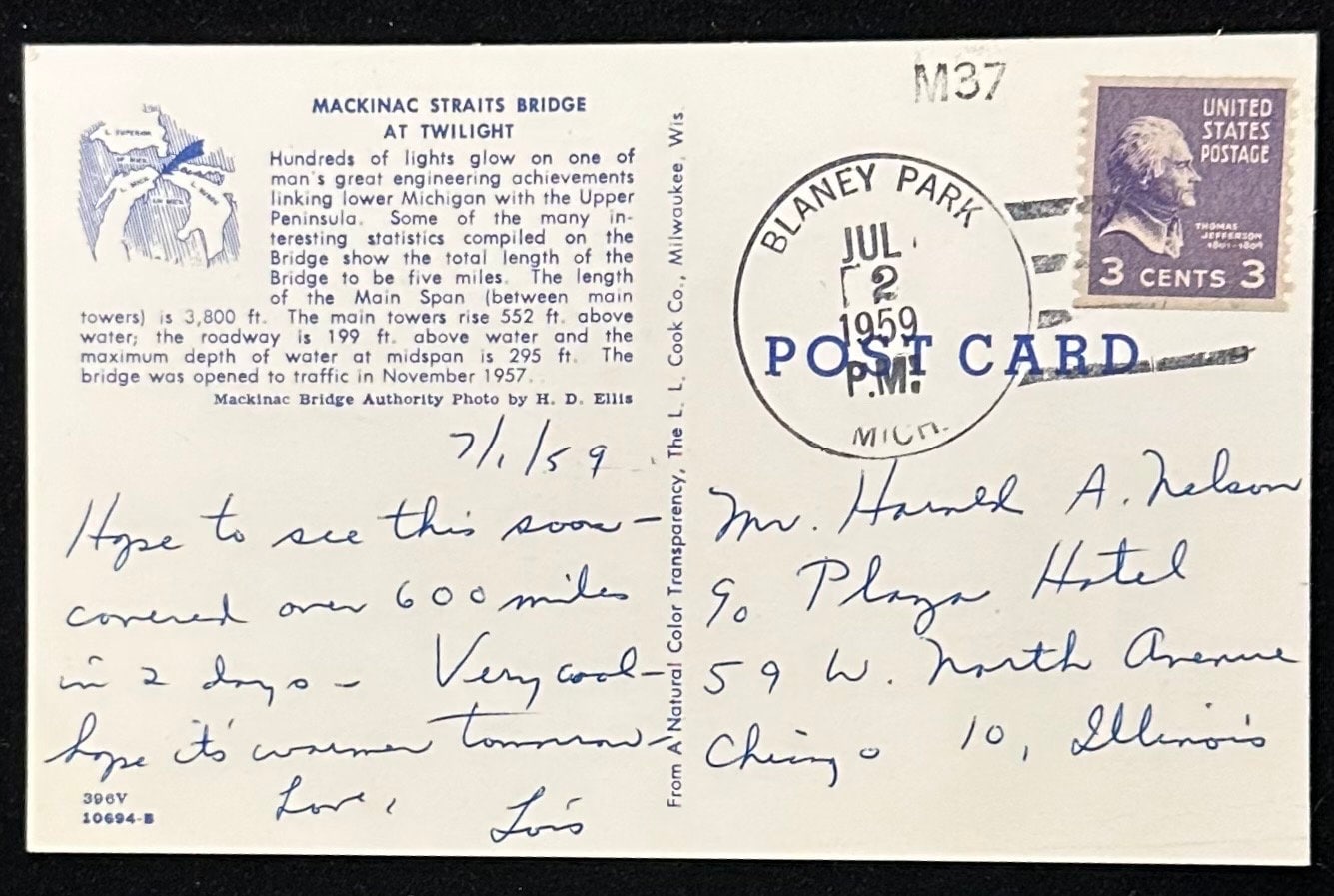 Mailed: Posted on July 2, 1959, from Blakey Park, Michigan, with a lilac 3-cent Thomas Jefferson stamp