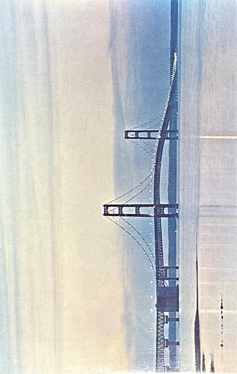 Hundreds of lights glow on one of man’s great engineering achievements linking lower Michigan with the Upper Peninsula. Some of the many interesting statistics compiled on the Bridge show that the total length of the Bridge is five miles. The length of the Main Span (between main lowers) is 3,800 ft. The main towers rise 552 ft above water, the roadway is 199 ft. above water, and the maximum depth of water at the mid span is 295ft. The bridge was opened to traffic in November 1957. - Mackinac Bridge Authority Photo by HD Ellies
