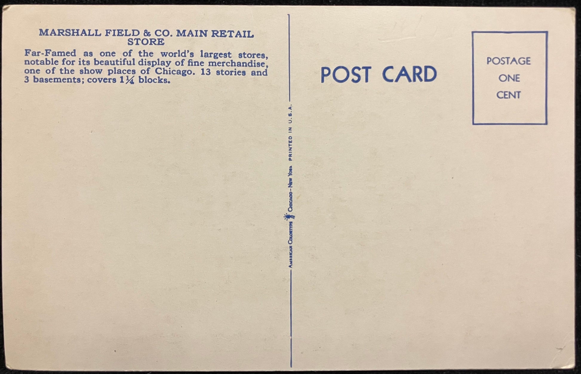 Back: Marshall Field & Co. Main Retail Store Far-Famed as one of the world's largest stores notable for its beautiful display of fine merchandise, one of the show places of Chicago. 13 stories and 3 basements; covers 1 1/4 blocks.