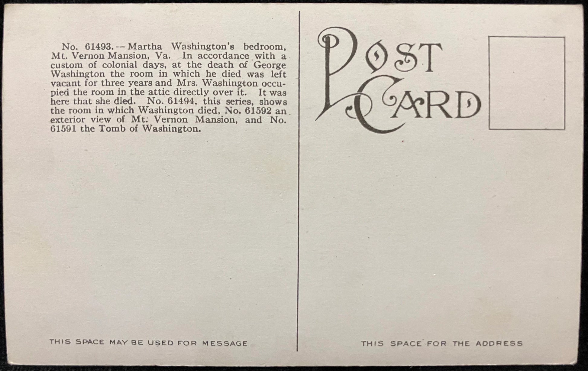 On back: No. 61493. - Martha Washington’s bedroom, Mt. Vernon Mansion, Va. In accordance with a custom of colonial days, at the death of George Washington the room in which he died was left vacant for three years and Mrs. Washington occupied the room in the attic directly over it. It was here that she died. No. 61494, this series, shows the room in which Washington died, No. 61592 an exterior view of Mt. Vernon Mansion, and No. 61591 the Tomb of Washington.