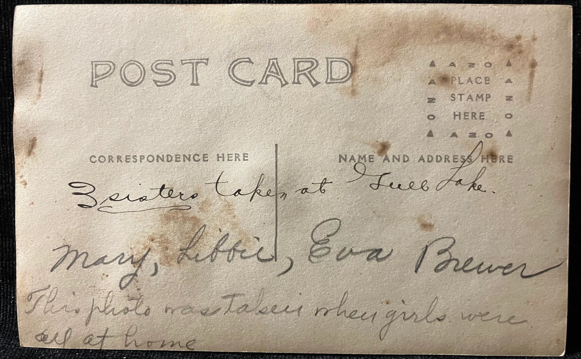 On front: A photo of three women, presumably Mary, Liffie, Eva Brewer