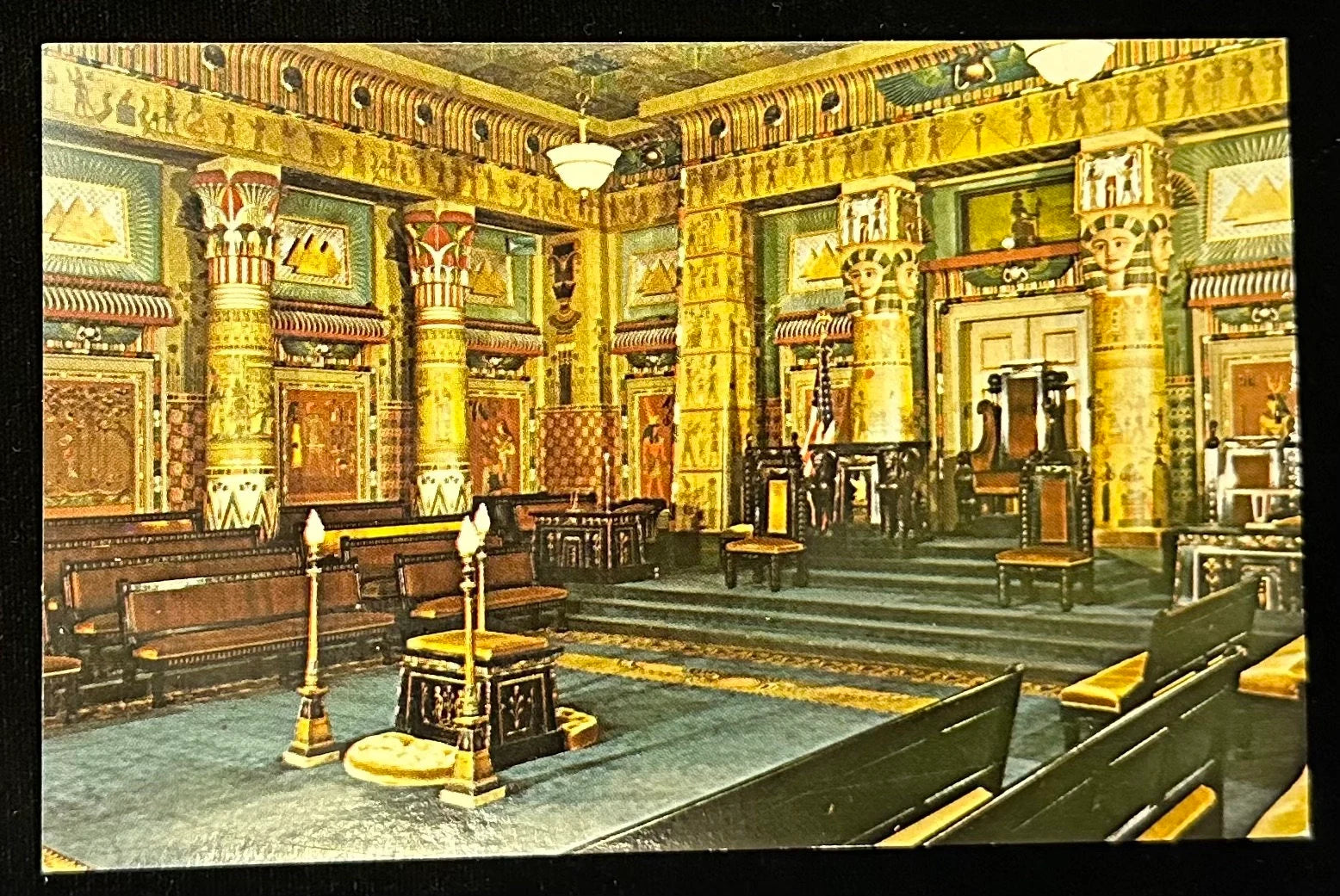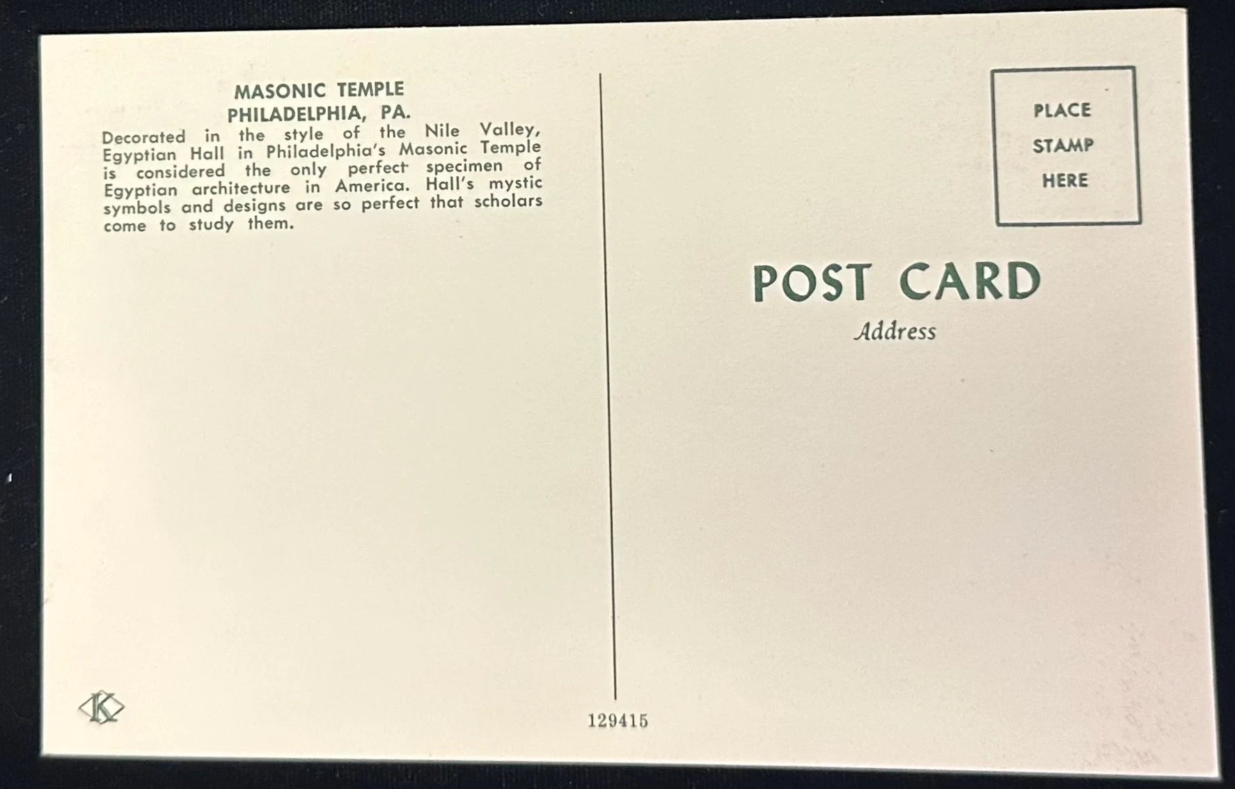 Back Information: Masonic Temple, Philadelphia, PA- Decorated in the style of the Nile Valley, Egyptian Hall in Philadelphia's Masonic Temple is considered the only perfect specimen of Egyptian architecture in America. Hall's mystic symbols and designs are so perfect that scholars come to study them,