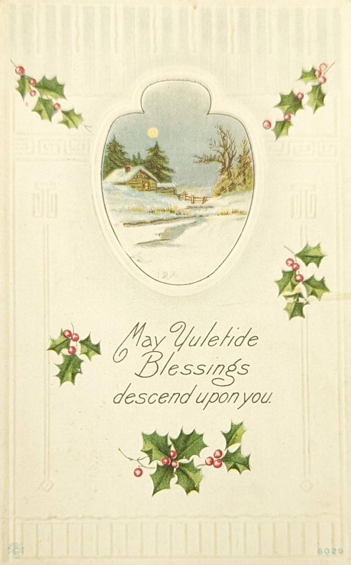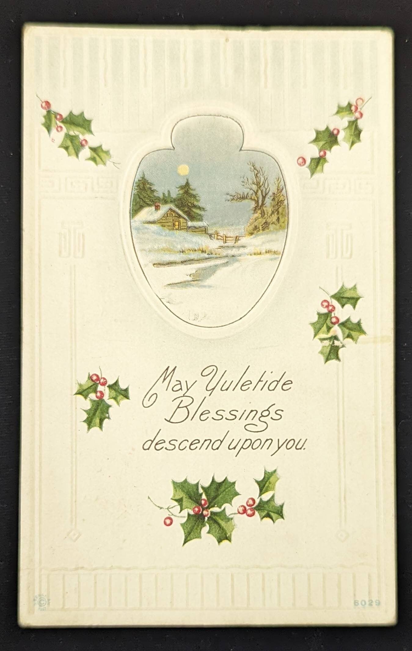 May Yuletide Blessings Descend Upon You - Vintage Embossed Christmas Postcard