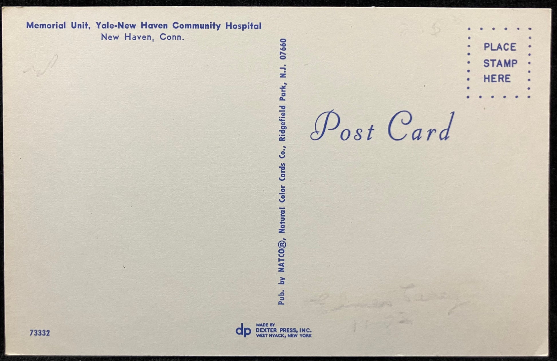 On back: Memorial Unit, Yale-New Haven Community Hospital, New Haven, Conn.
