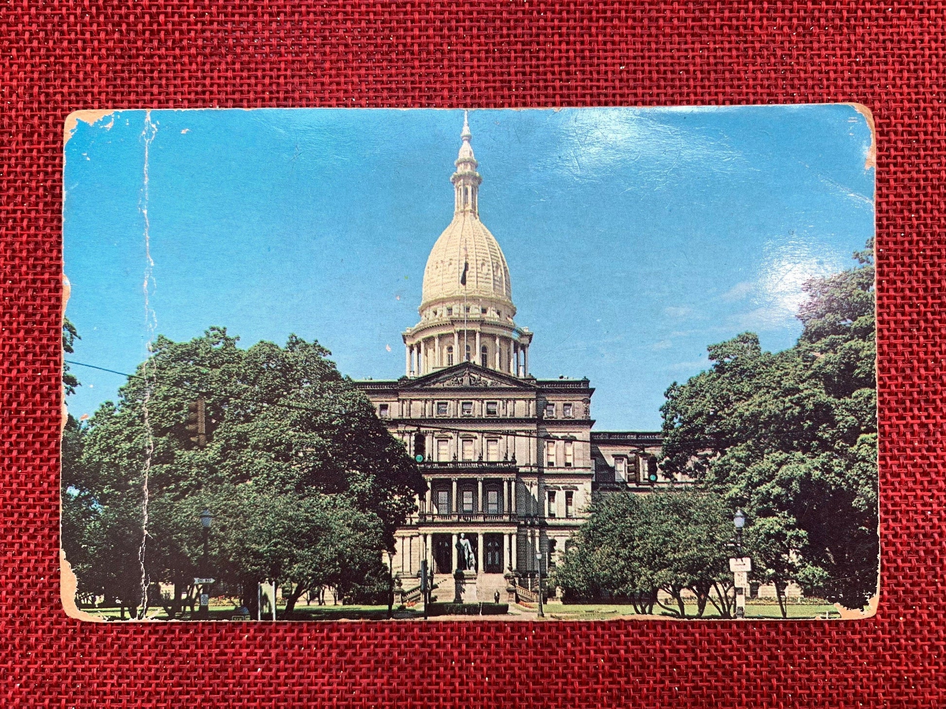 This plastichrome postcard features a photograph of the Michigan State Capitol in Lansing, Michigan.