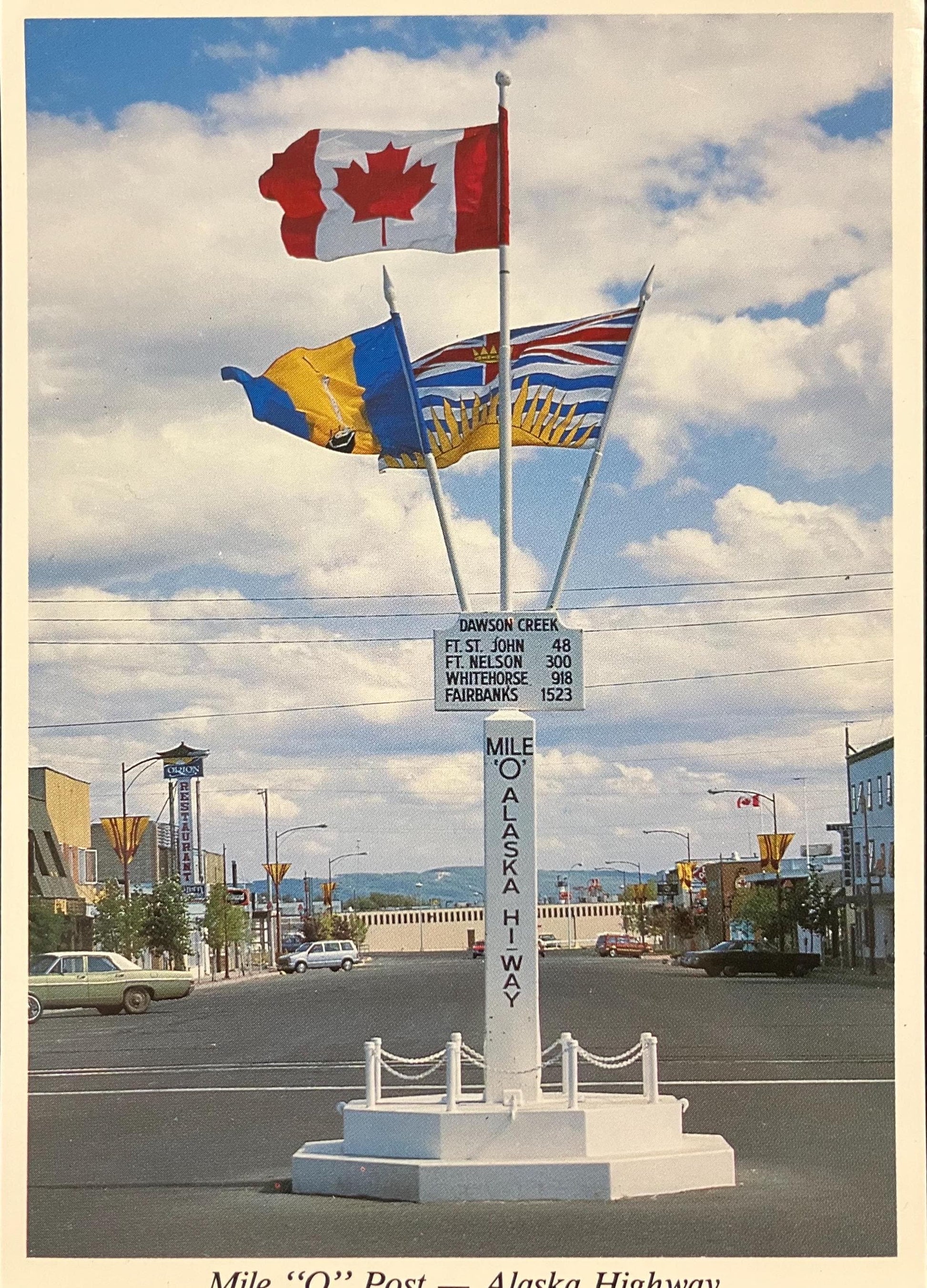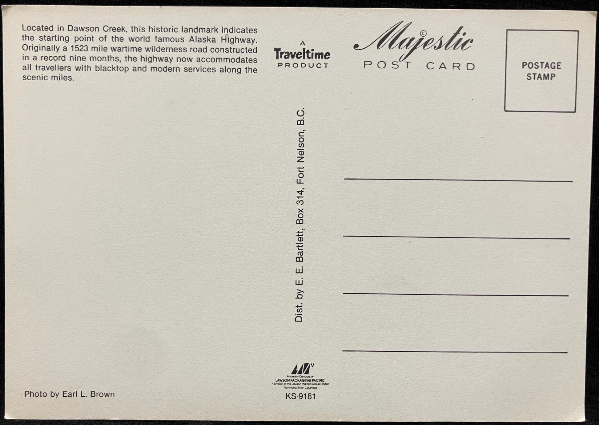 Back: Located in Dawson Creek, this historic landmark indicates the starting point of the world famous Alaska Highway. Originally a 1523 mile wartime wilderness road constructed in a record nine months, the highway now accommodates all travellers with blacktop and modern services along the scenic miles.