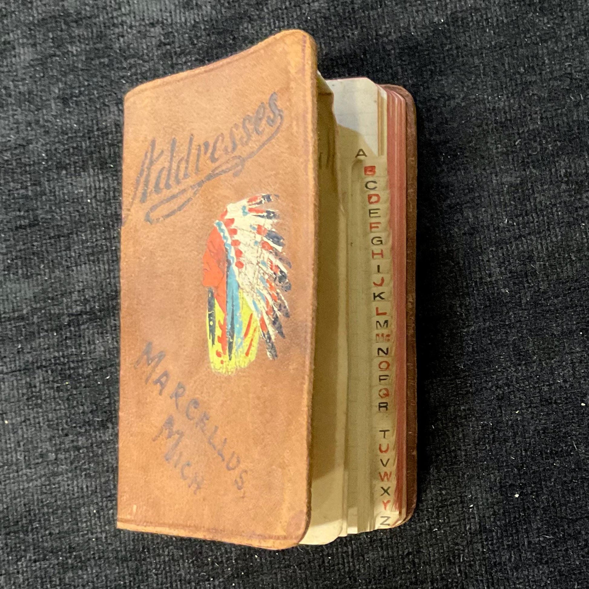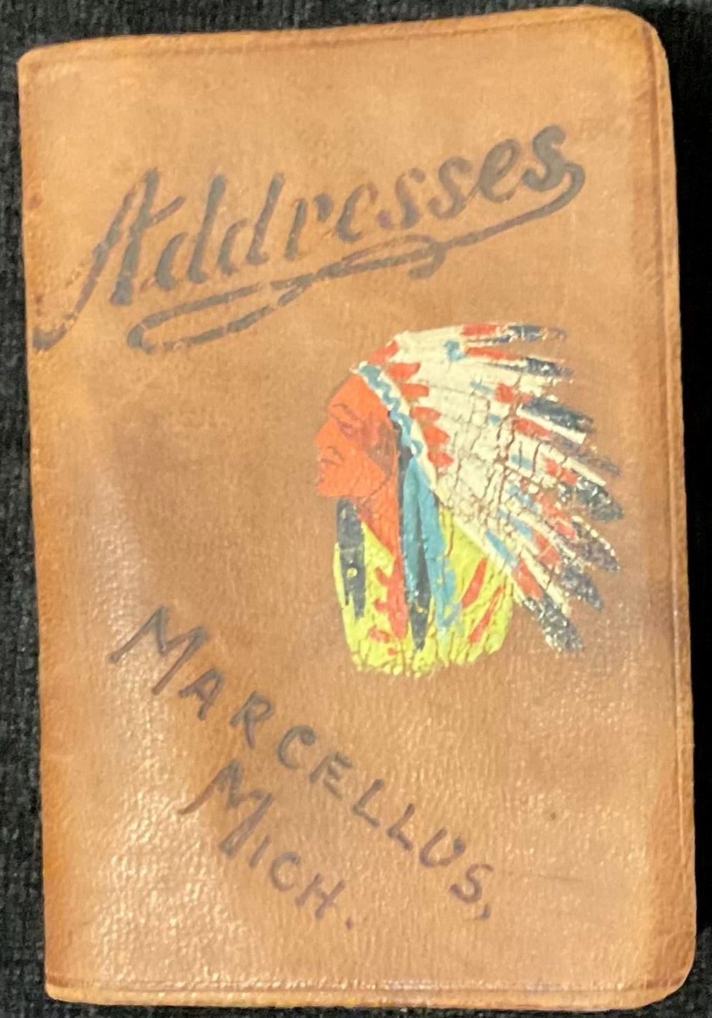 This is an address book from Marcellus, a small village in southwest Michigan. Indigenous people made these books in the early 1900s and sold them to travelers as souvenirs. The cover of the book features "Addresses" heat stamped at the top above a painting of an Indigenous person with a traditional headdress and another stamp of "Marcellus, Mich." The book is organized with tabs for each letter of the Latin alphabet. There are additional pages at the end of the book that are blank and unlabeled with a letter. Aside from some aging, the book is in good condition, appropriate for a book of this age. Price range: