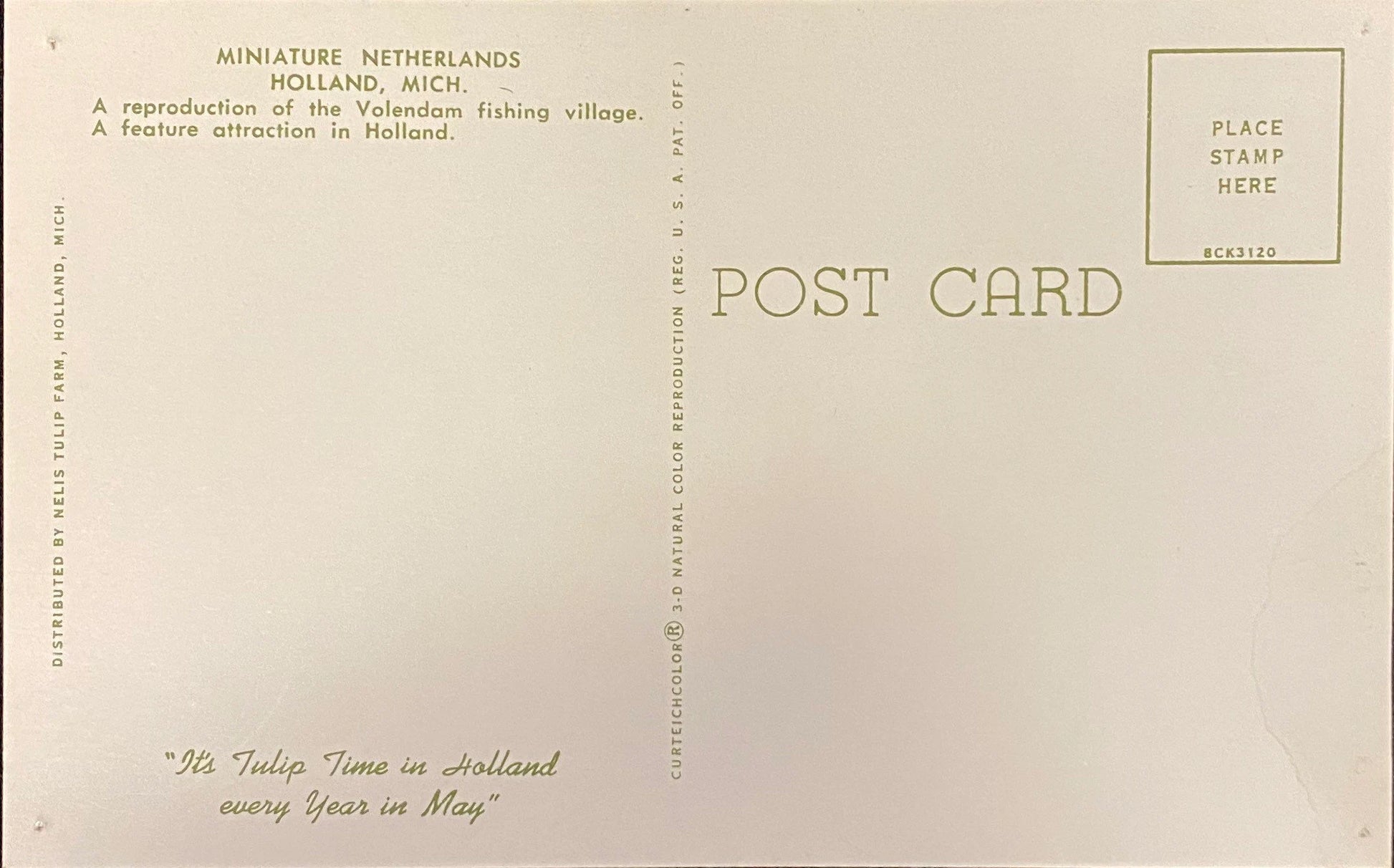 Holland, Michigan, is rich in Dutch culture. One attraction is a reproduction of the Volendam fishing village. The real fishing village is not far from Amsterdam and is known for its harbor, fishing trade, and Dutch character. The perfect postcard for someone from Holland! This postcard is in good condition with a small stain on the back.
