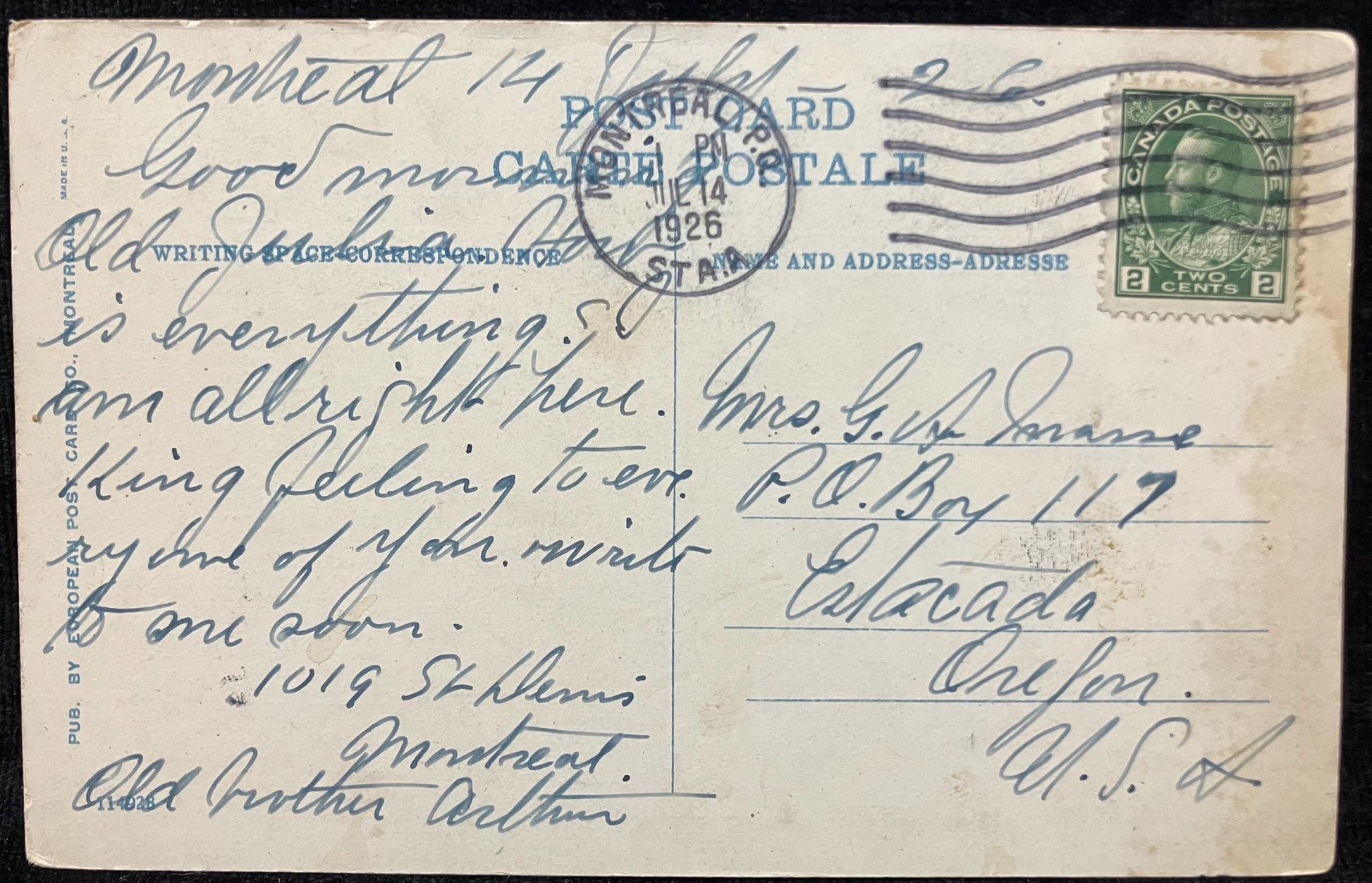 Mailed: Postmark: 1926 green two cent King Edward VII stamp