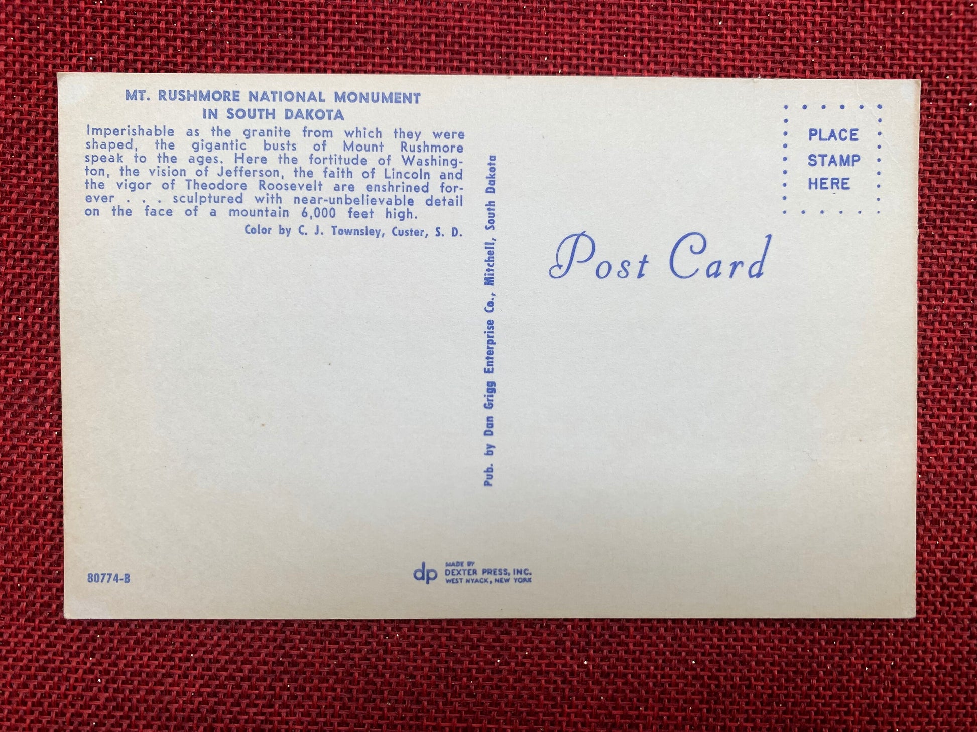 Back Text: "MT. RUSHMORE NATIONAL MONUMENT IN SOUTH DAKOTA