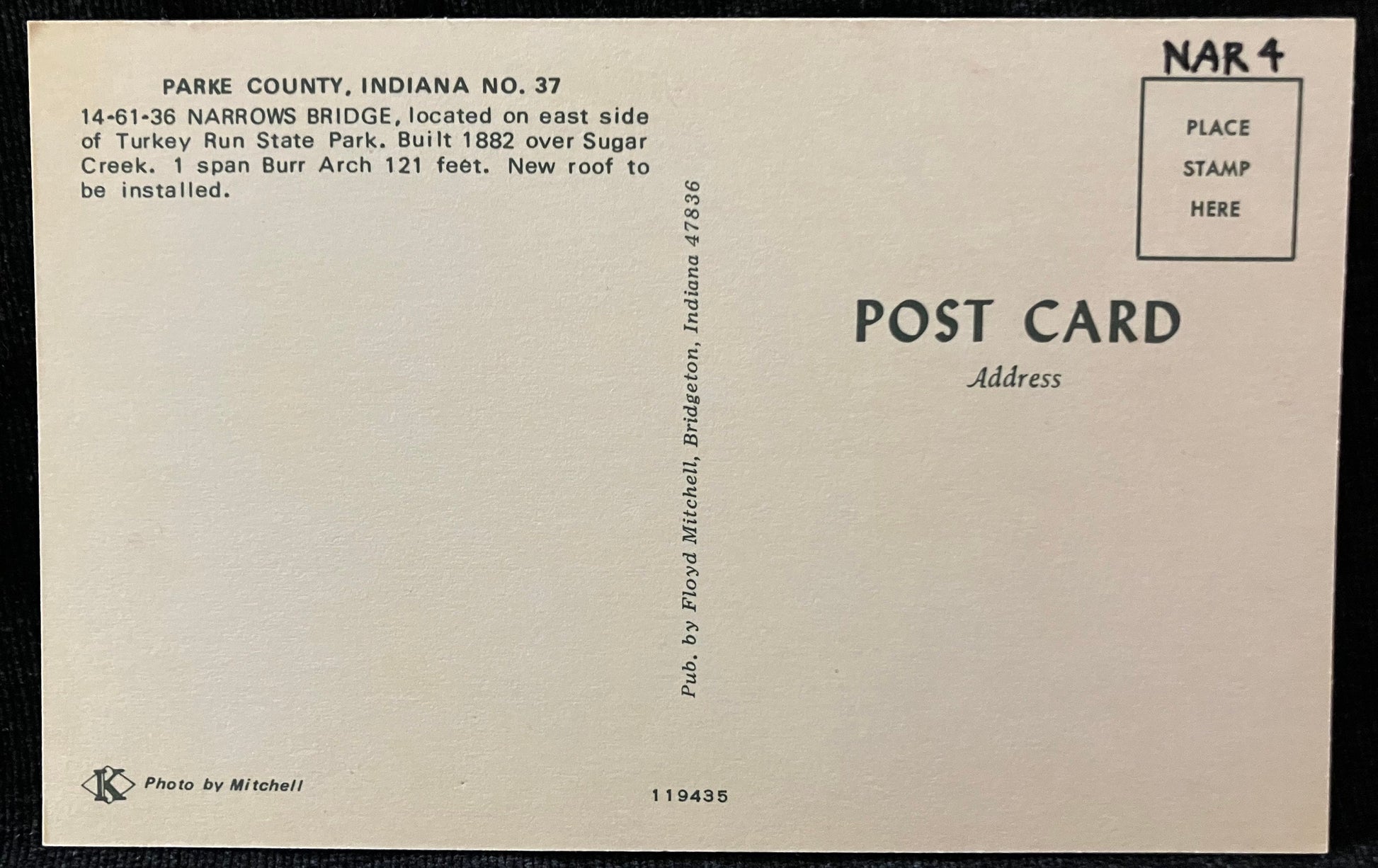 back: Parke County, Indiana No. 37 14-61-36 Narrows Bridge, located on the east side of Turkey Sun State Park. Built 1882 over Sugar Creek. 1 span Burr Arch 121 feet. New roof to be installed.
