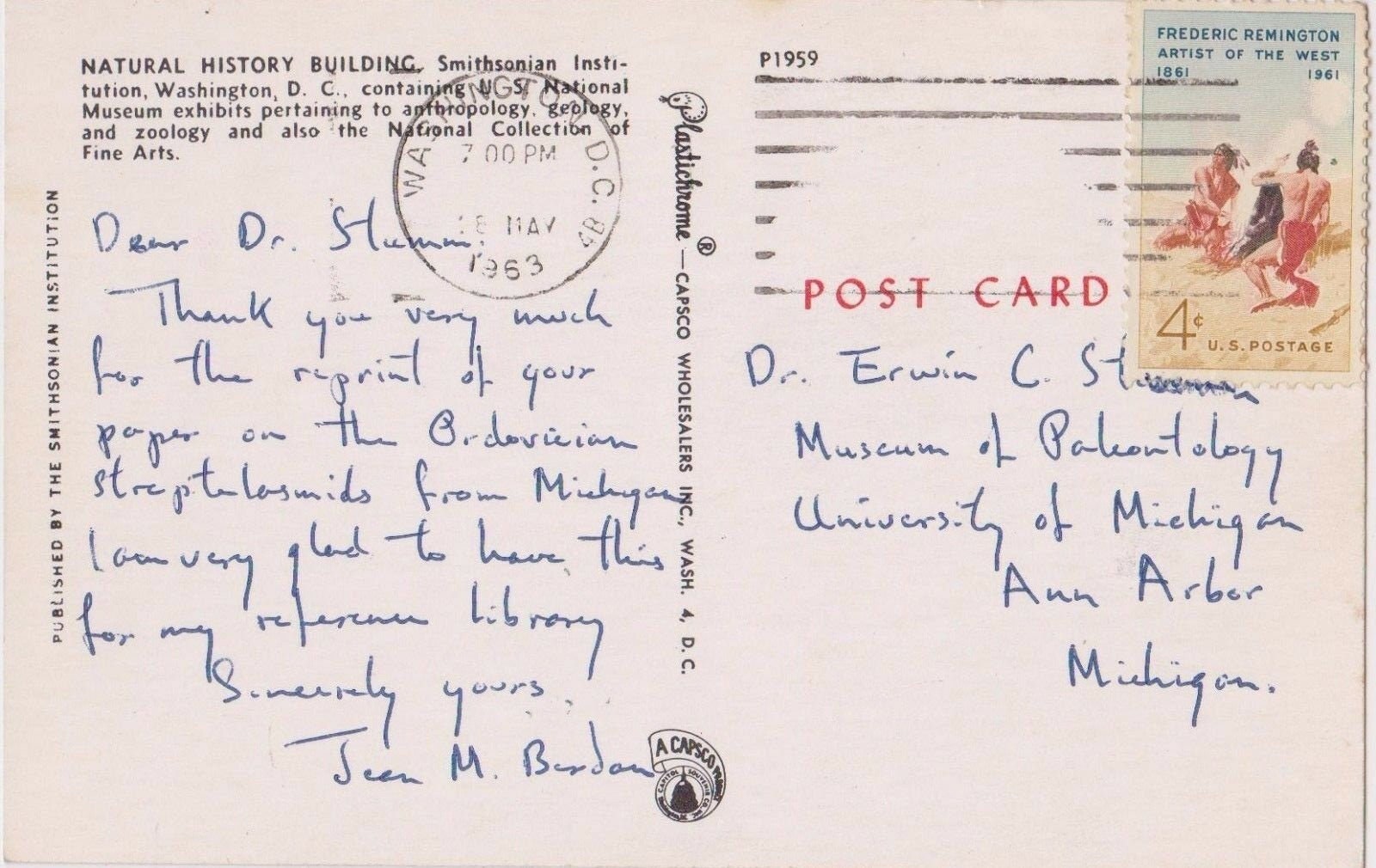 Thank you very much for the reprint of your paper on the Ordovician Streptelasmids from Michigan. I am very glad to have this for my reference library. Sincerely yours, Jean M. Berdan."