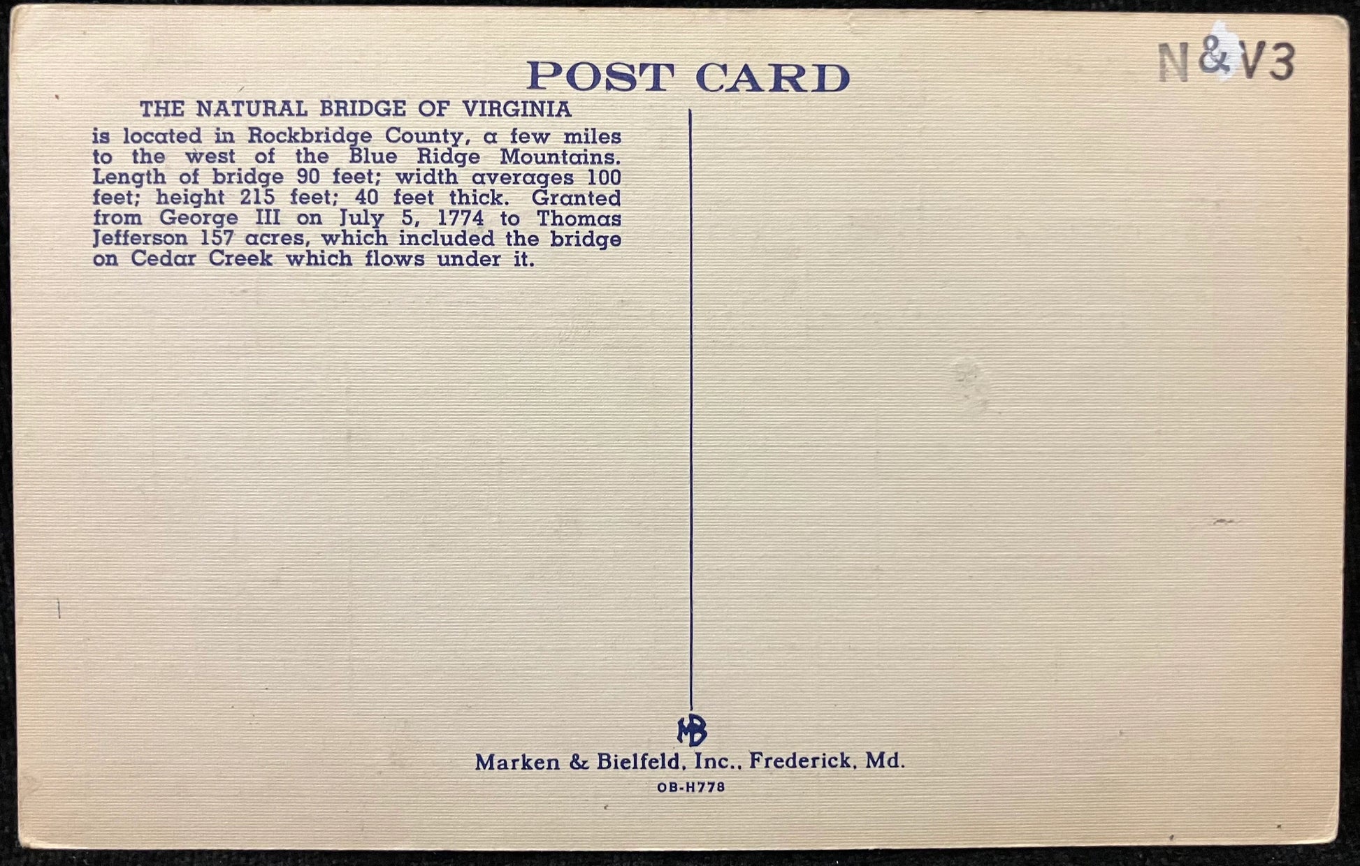 Back: THE NATURAL BRIDGE OF VIRGINA is located in the Rock Bridge Mountains. Length of bridge 90 feet; width averages 100 feet; height 215 feet; 40 feet thick. Granted from George III on July 5, 1774 to Thomas Jefferson 157 acres, which included the bridge on Cedar Creek which flows under it.
