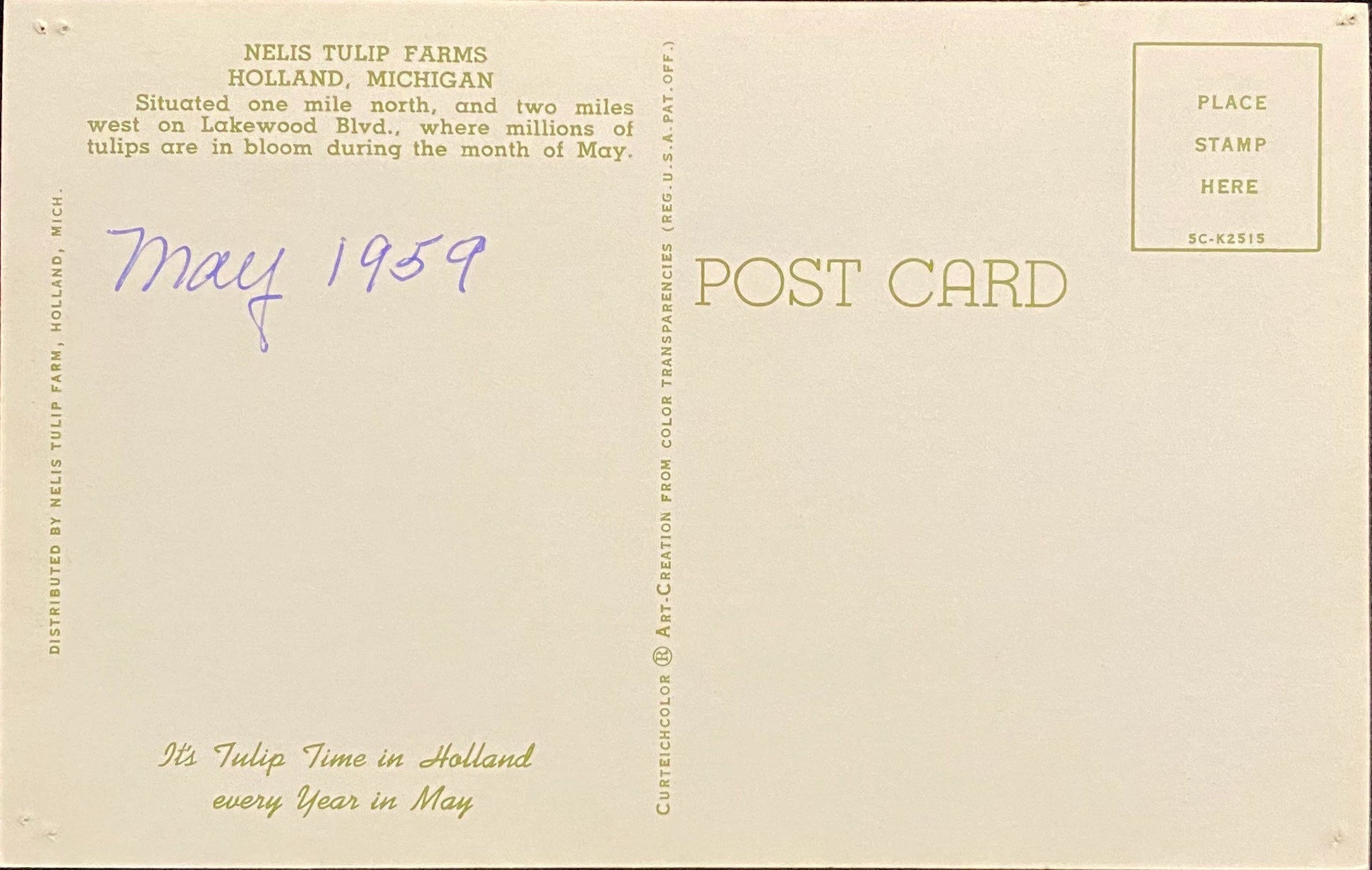 Back Text: "Nelis Tulip Farms Holland, Michigan. Situated one mile north, and two miles west on Lakewood Blvd., where millions of tulips are in bloom during the month of May."