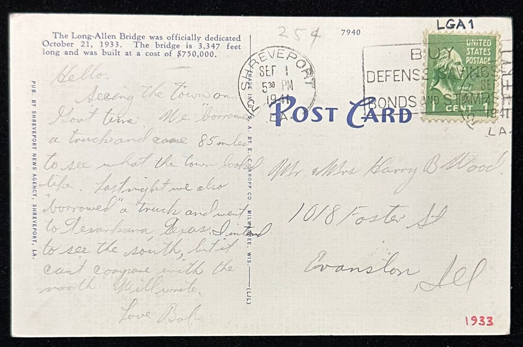 Mailed: Posted on September 1, 1941 from Shreveport, Louisiana with a green 1 cent President George Washington stamp