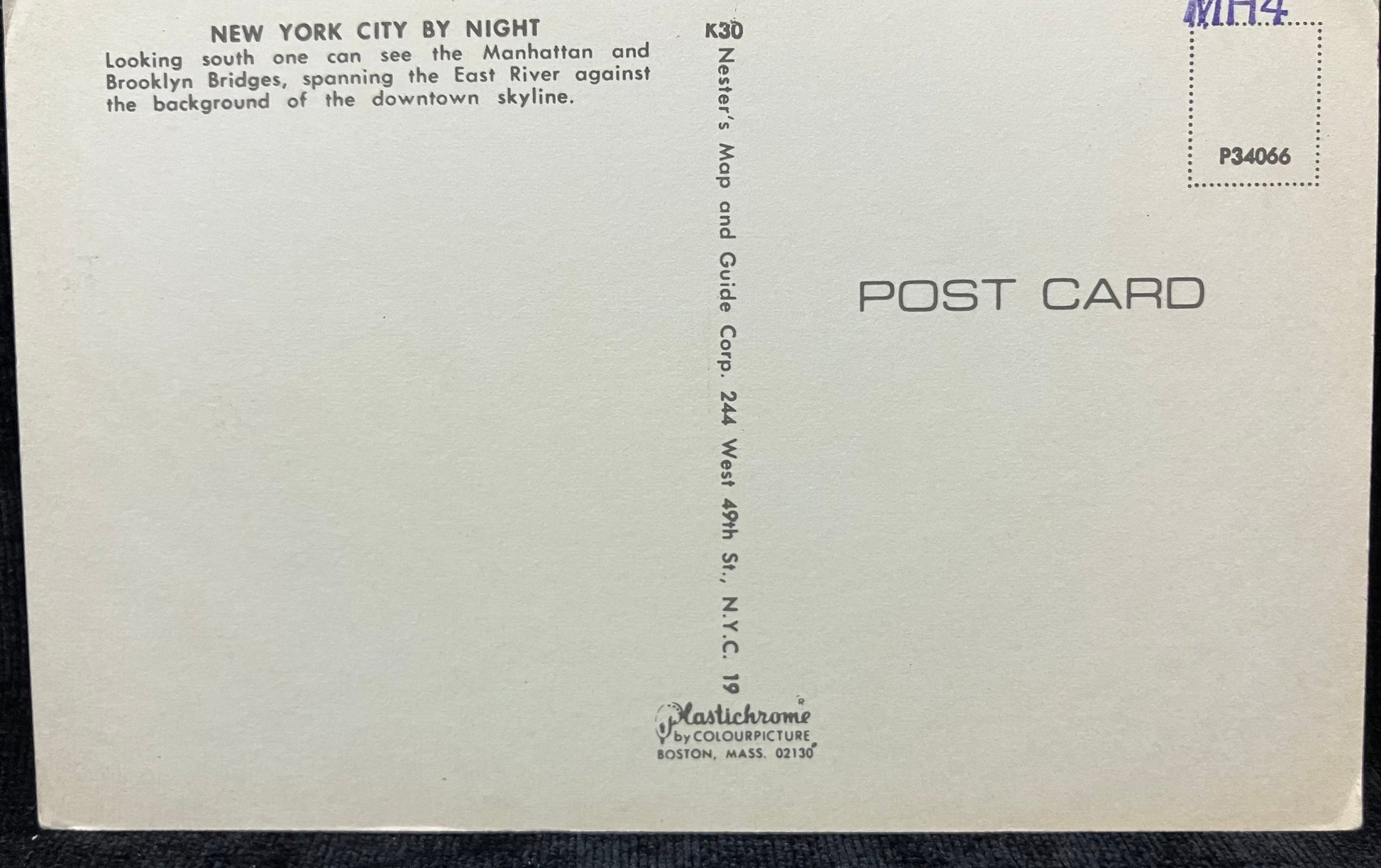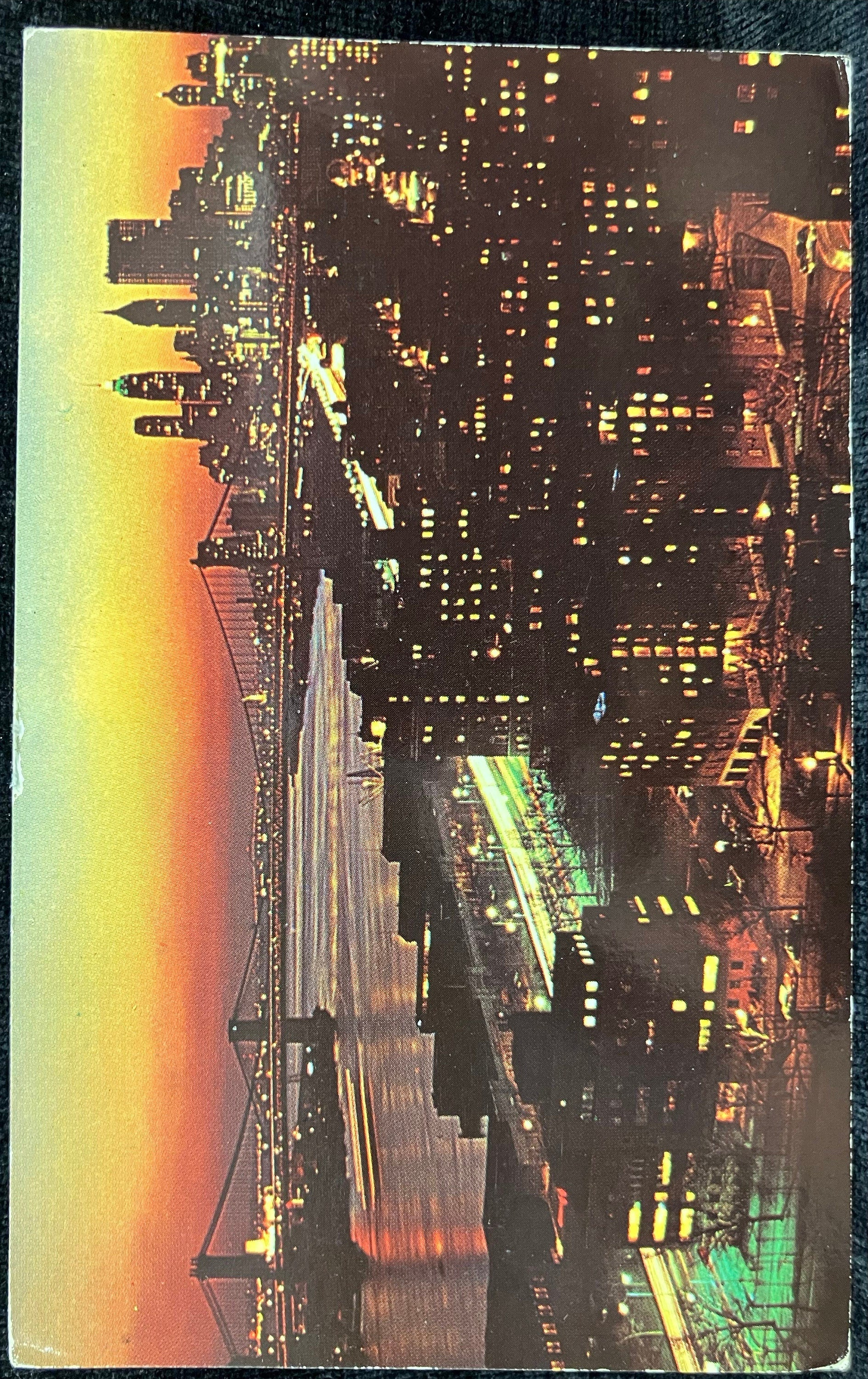 Back: NEW YORK CITY BY NIGHT Looking south one can see the Manhattan and Brooklyn Bridges, spanning the East River against the background of the downtown skyline.
