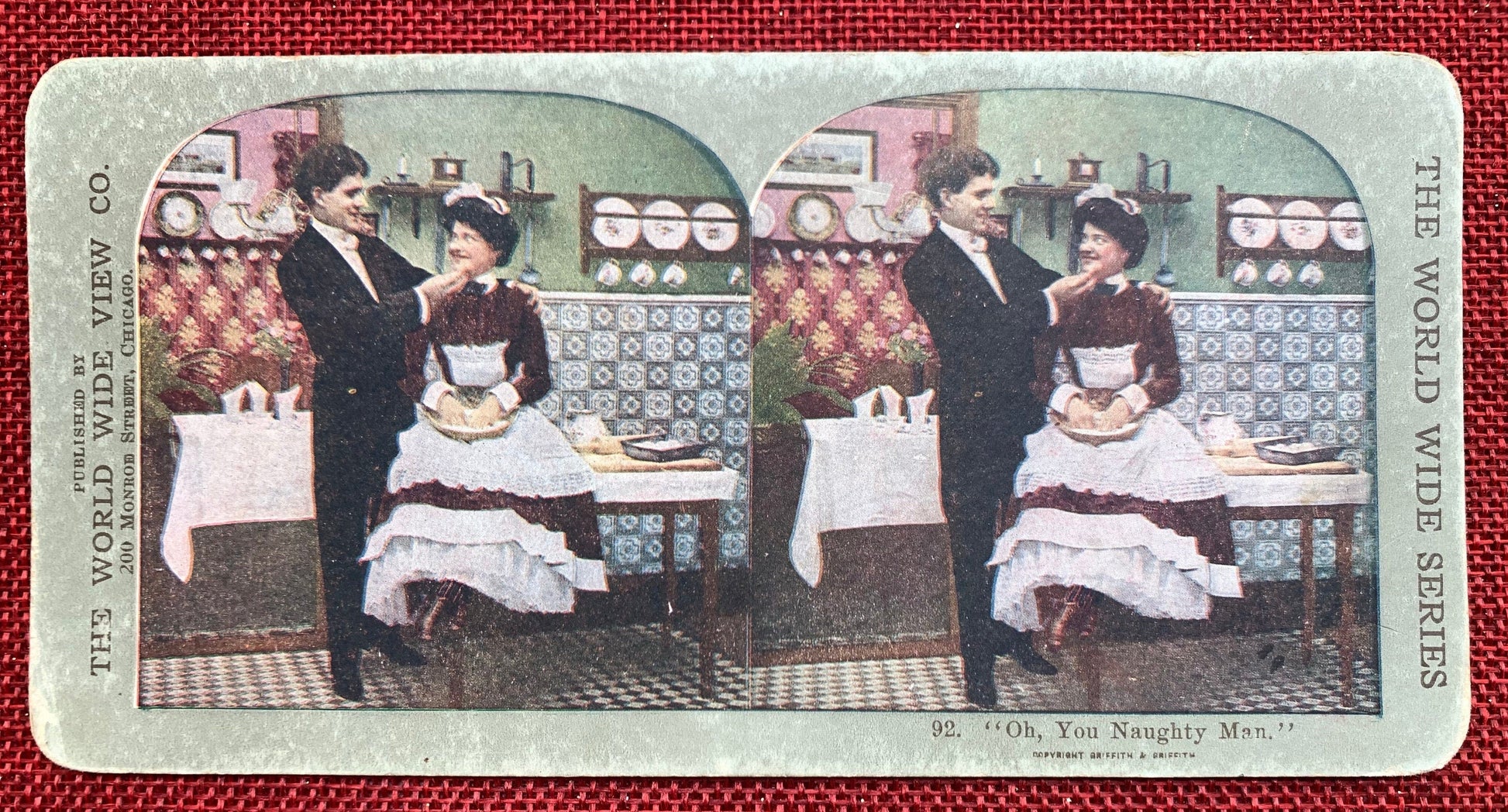 Oh, You Naughty Man - Man With His Arm Around a Woman's Shoulder in a Kitchen - Stereo View Card - Early 1900s