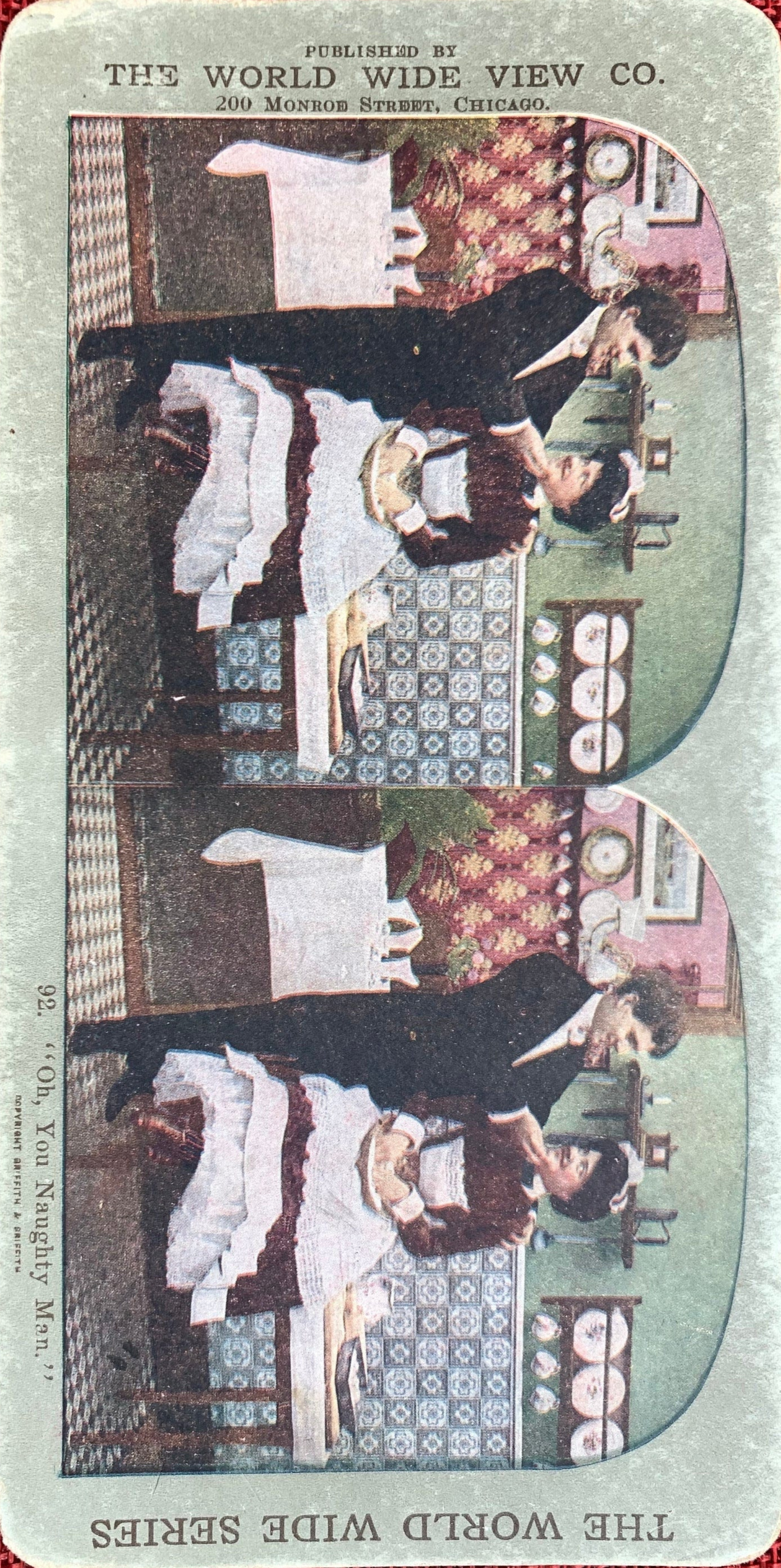 This vintage stereo view card features two color images of a woman sitting on a kitchen table with a man putting his arm around her shoulders. The woman's dress suggests she is a maid or cook.