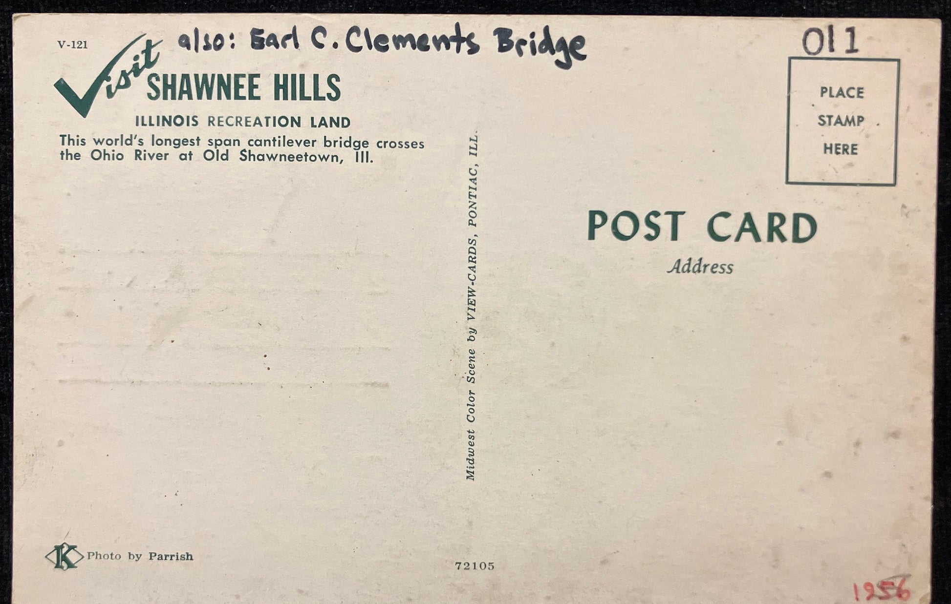 On back: Visit Shawnee Hills Illinois Receation Land This world’s longest span cantilever bridge crosses the Ohio River at Old Shawneetown, Ill.