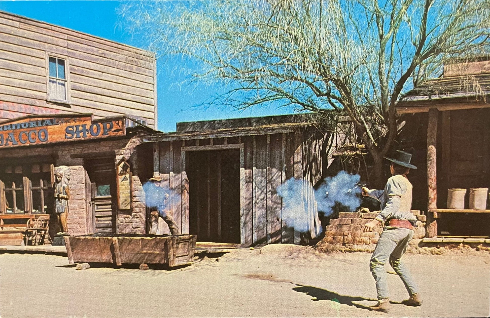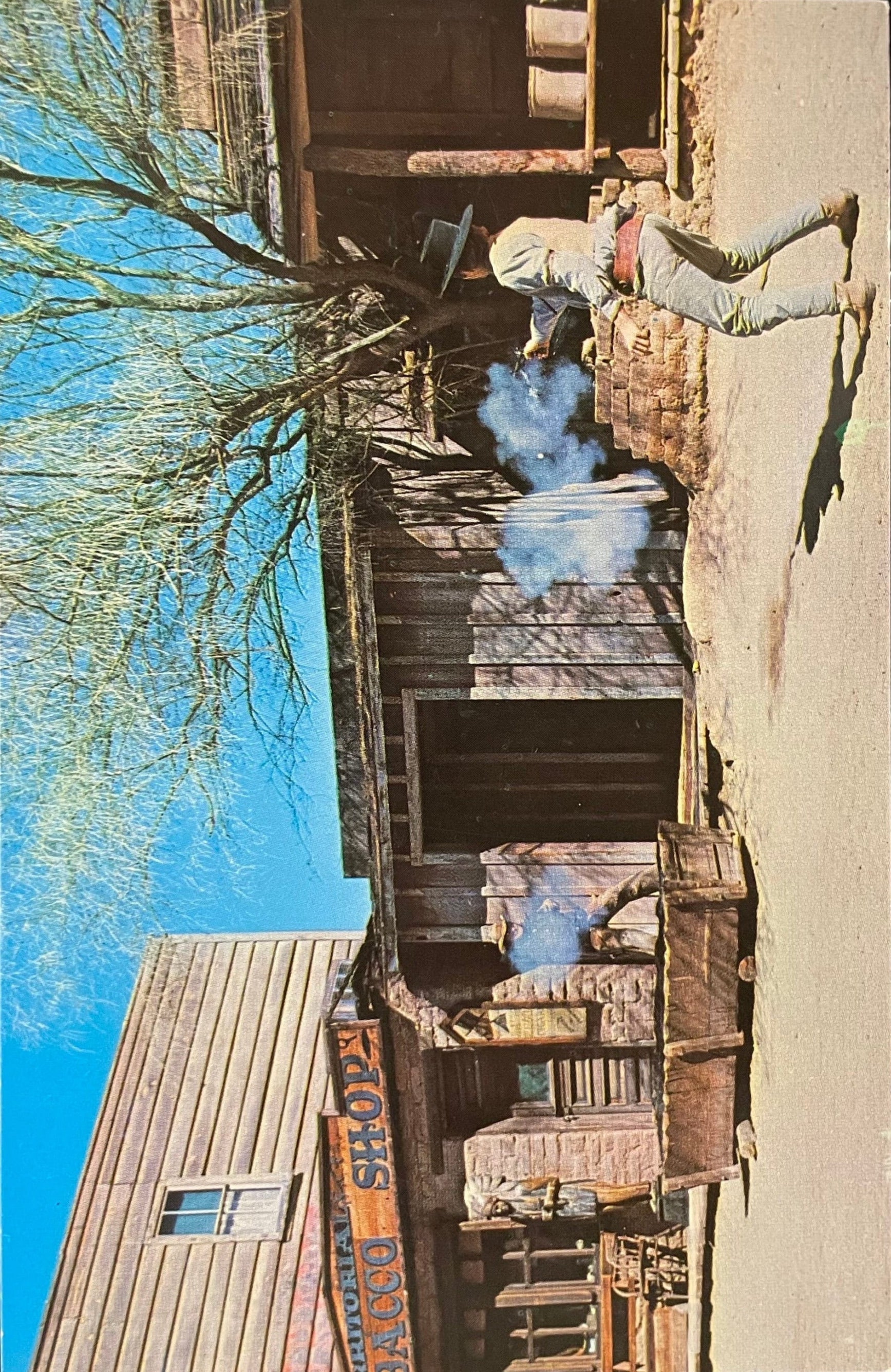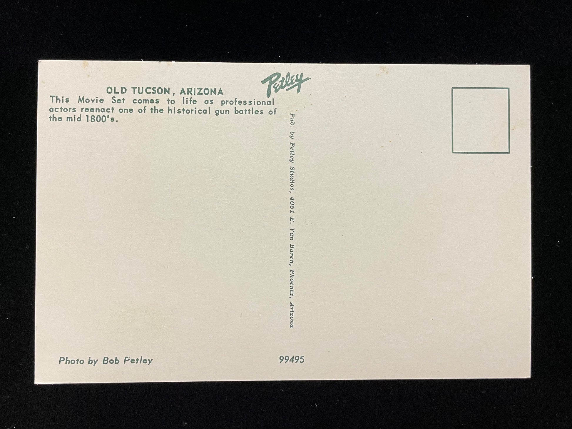 Back information "Old Tucson, Arizona- This Movie Set comes to life as professional actors reenact one of the historical gun battles of the mid 1800's."