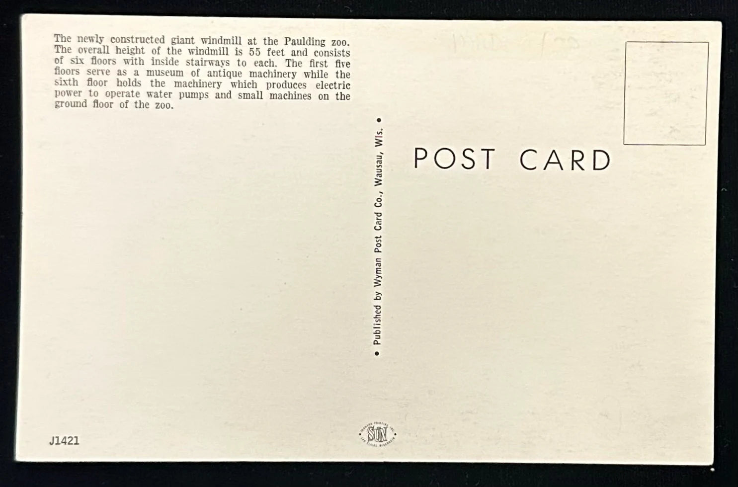 Paulding Zoo Windmill - Wausau, Wisconsin - Vintage 1960s Postcard