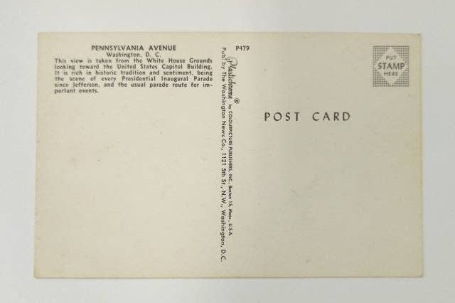 Front: A beautiful vintage postcard featuring Pennsylvania Avenue in Washington, D.C.