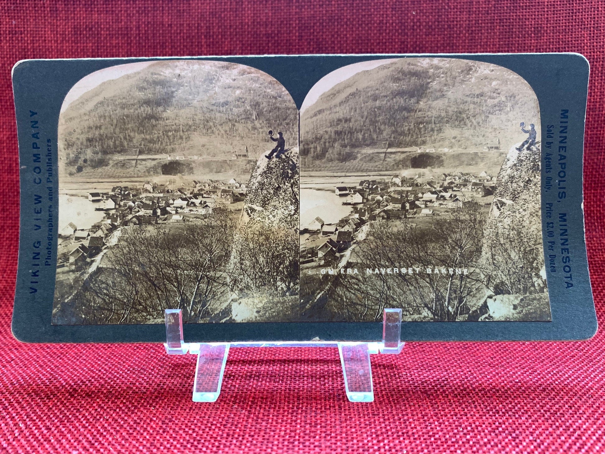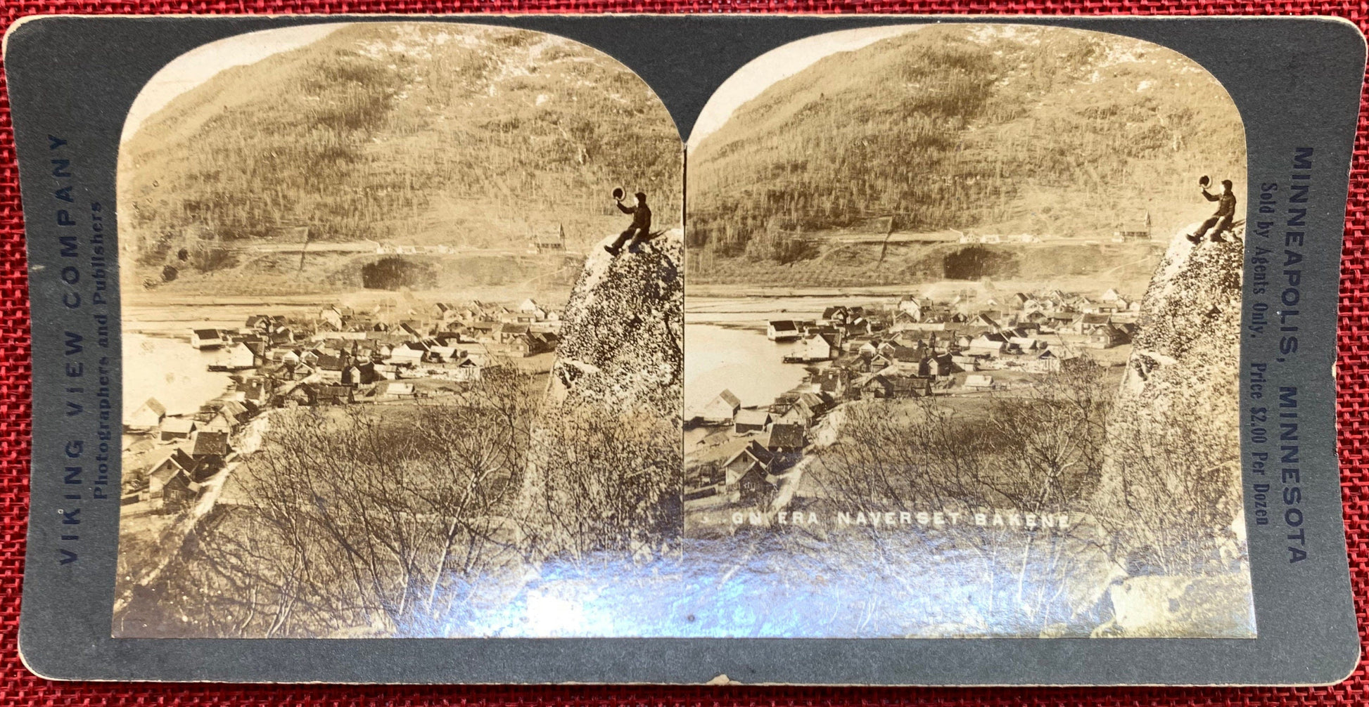 This vintage stereo card features two sepia toned photographs of a town with a person on the edge of a mountain looking down at the town. When googled, the title of this card doesn't have a simple translation. It is likely Norwegian, and translates roughly to "- from the back of the mountain/parish"