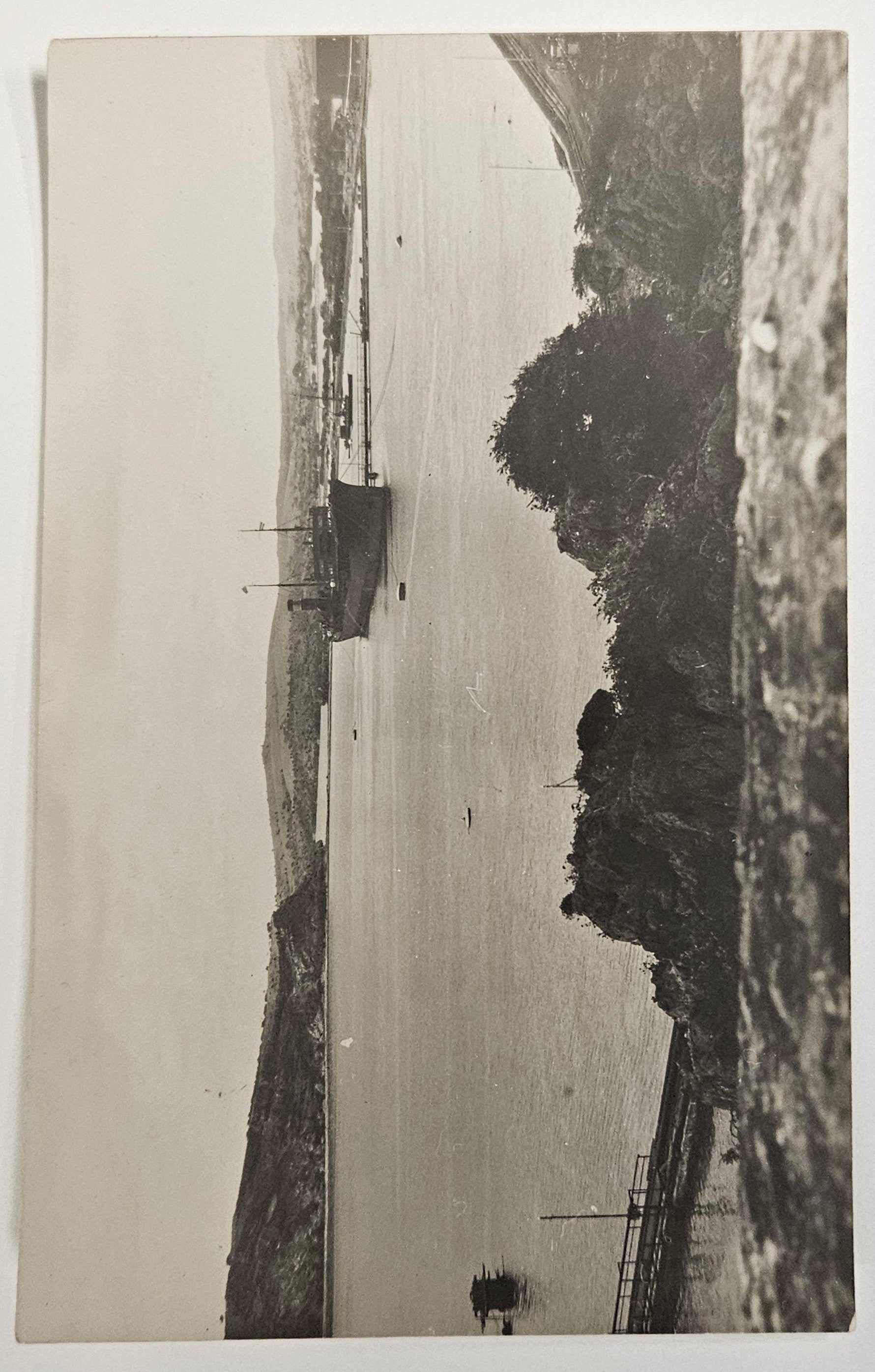 Photo Of Large Battle Ship entering a Valley Harbor - 1930 to 1940. It appears to be an American Ship. The photo has no copy on it, but looks like taken a a wartime photo.
