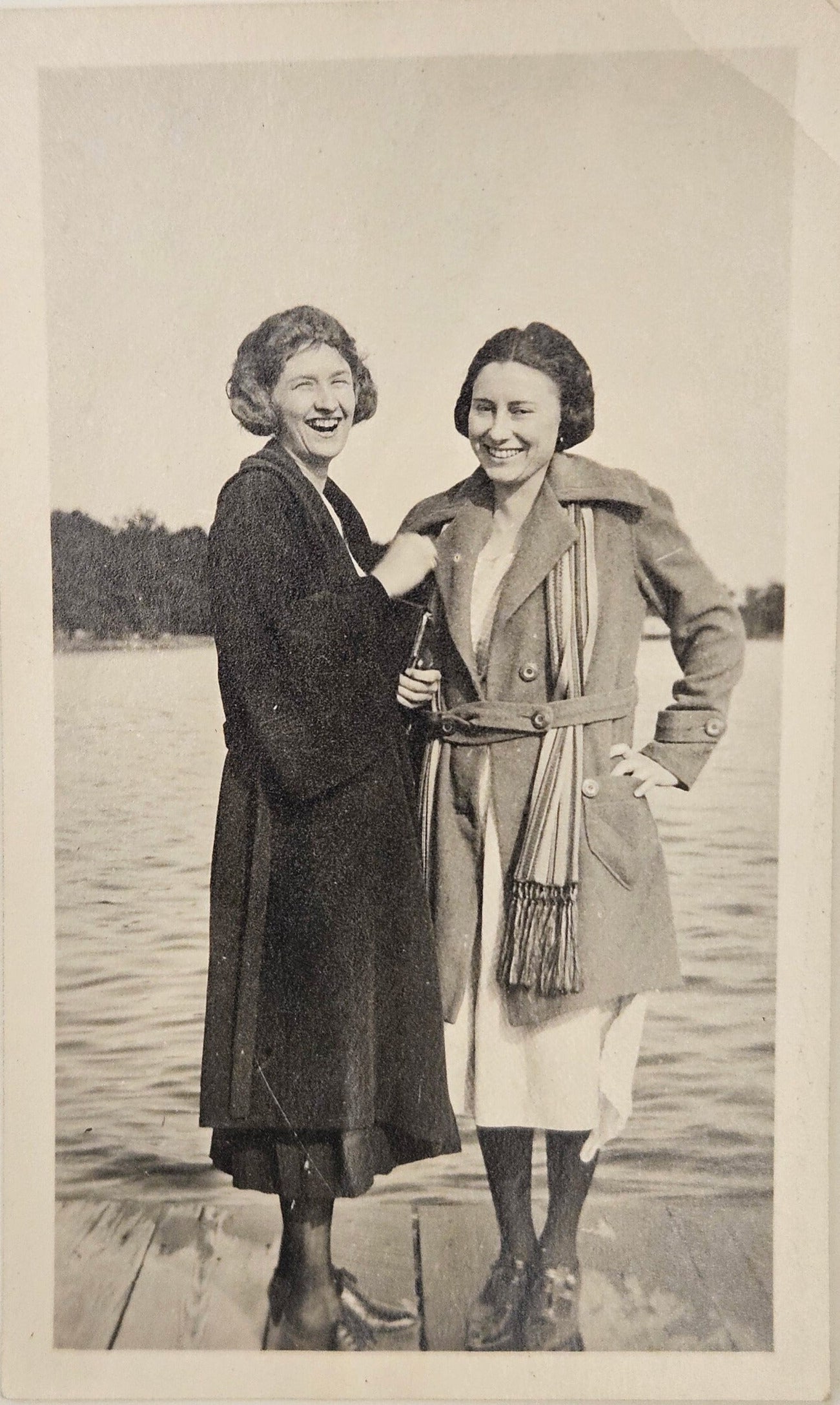 Photo Of Two Smiling Women On Dock -wearing Fashionable Outerwear with t hair styles popular in the late 1920s and early 1930s, Short and Wavy - Spring is Arriving at the lake they are near, the Photo was found in Michigan. May be Lake Michigan in background.