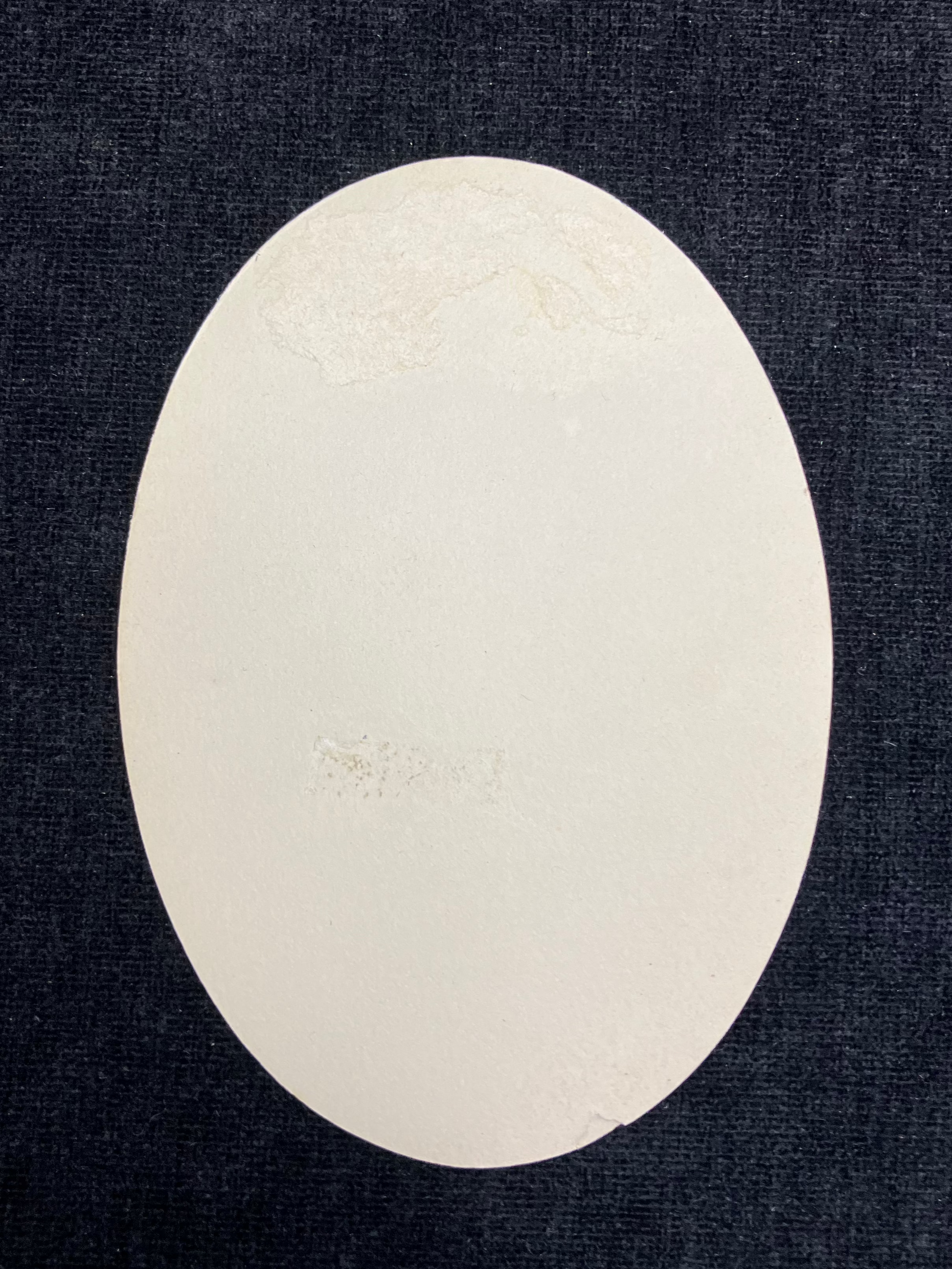 Condition: Mild silvering of dark background. Adhesive residue from previous hangings on top and middle of back. Small chip at bottom right of back.