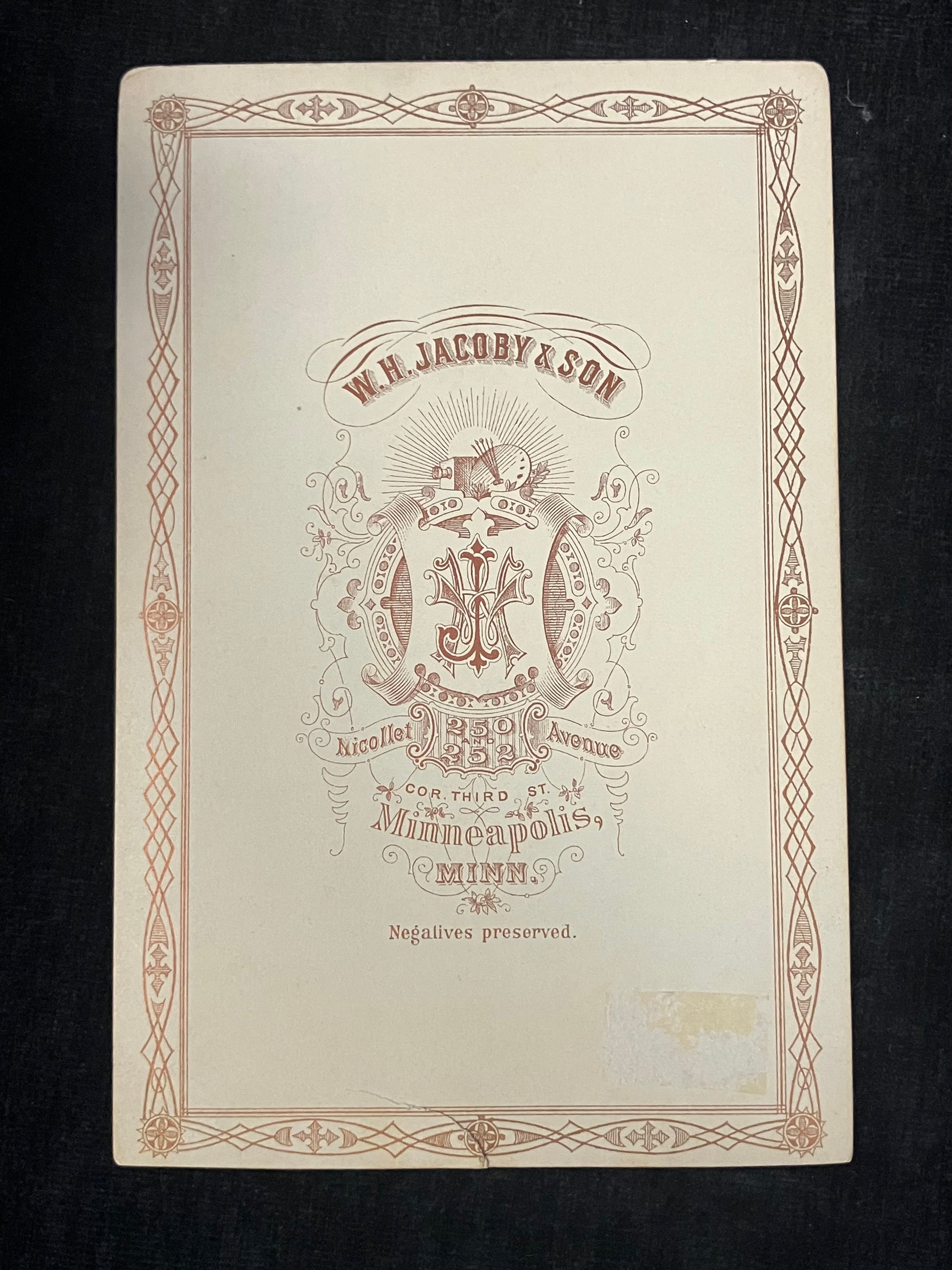 The photographer is listed on the back as W. H. Jacoby & Son, a photography studio active only from 1887-1888.