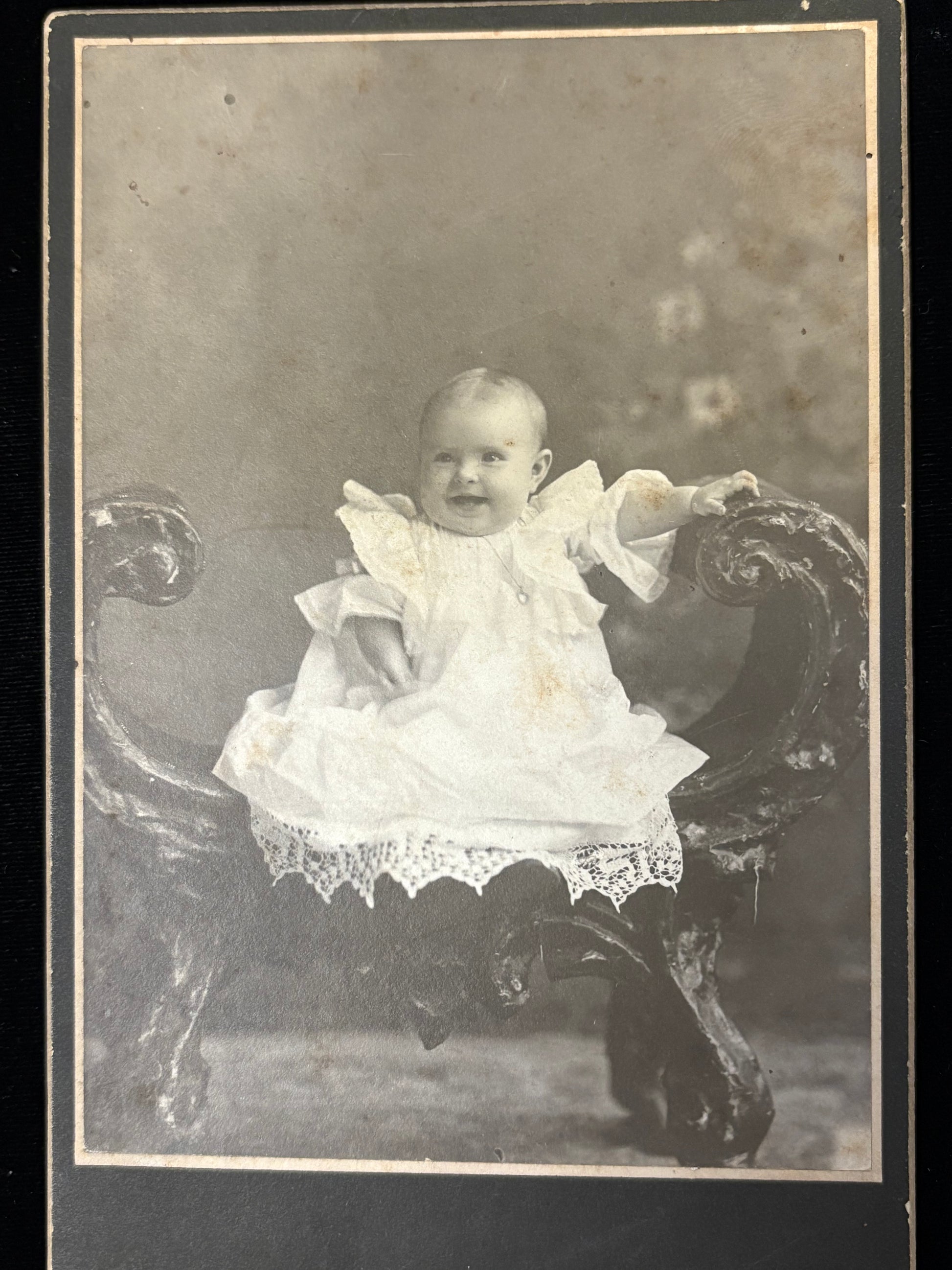 This beautiful infant, who appears to be about 8 months old, is bubbling with joy at getting her picture taken. Dressed in a fabulous, lace day dress, she is all dolled up for her very first photograph. The parents spared no expense when picking the perfect dress, an elegant carved Bench prop, and the expensive black mounting card. This little girl was looking forward to a life with all the perks of the era.