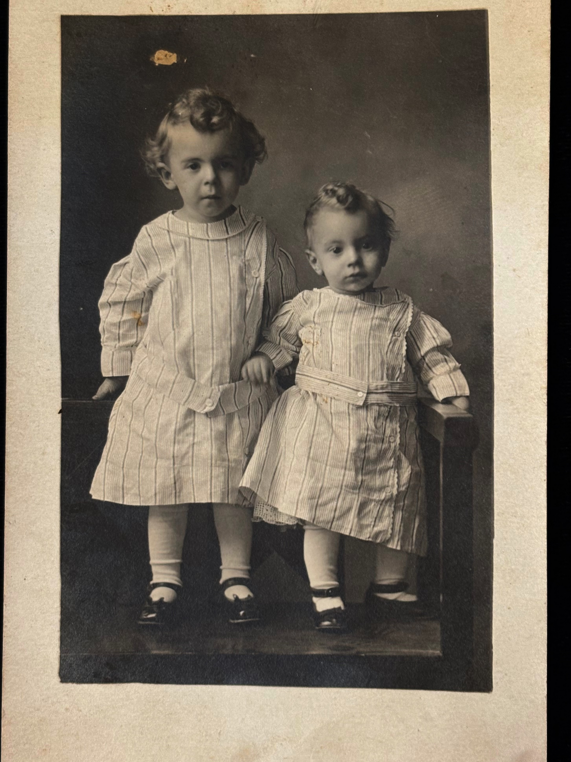 These two young boys, just beyond the toddler stage, are dressed to the nines in striped gowns and white tights. The Real Photo Postcard was likely made in the 1920s, but these young boys are undoubtedly rocking the Little Lord Fauntleroy look from the 1880s!