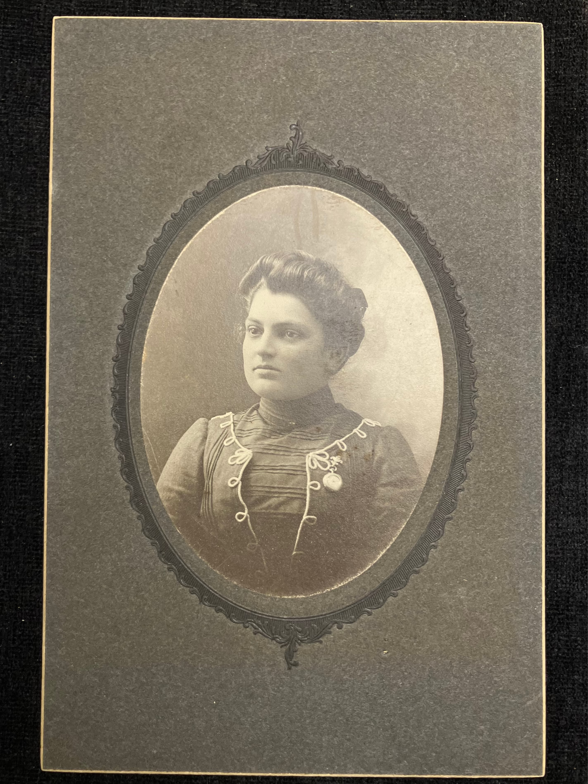 The beveled cardboard frame was introduced in 1892 as a fancier alternative to traditional cards, and black was the most enviable, luxurious color. Embossed framing designs, too, were introduced in 1894 and defined the style of photos from this time.