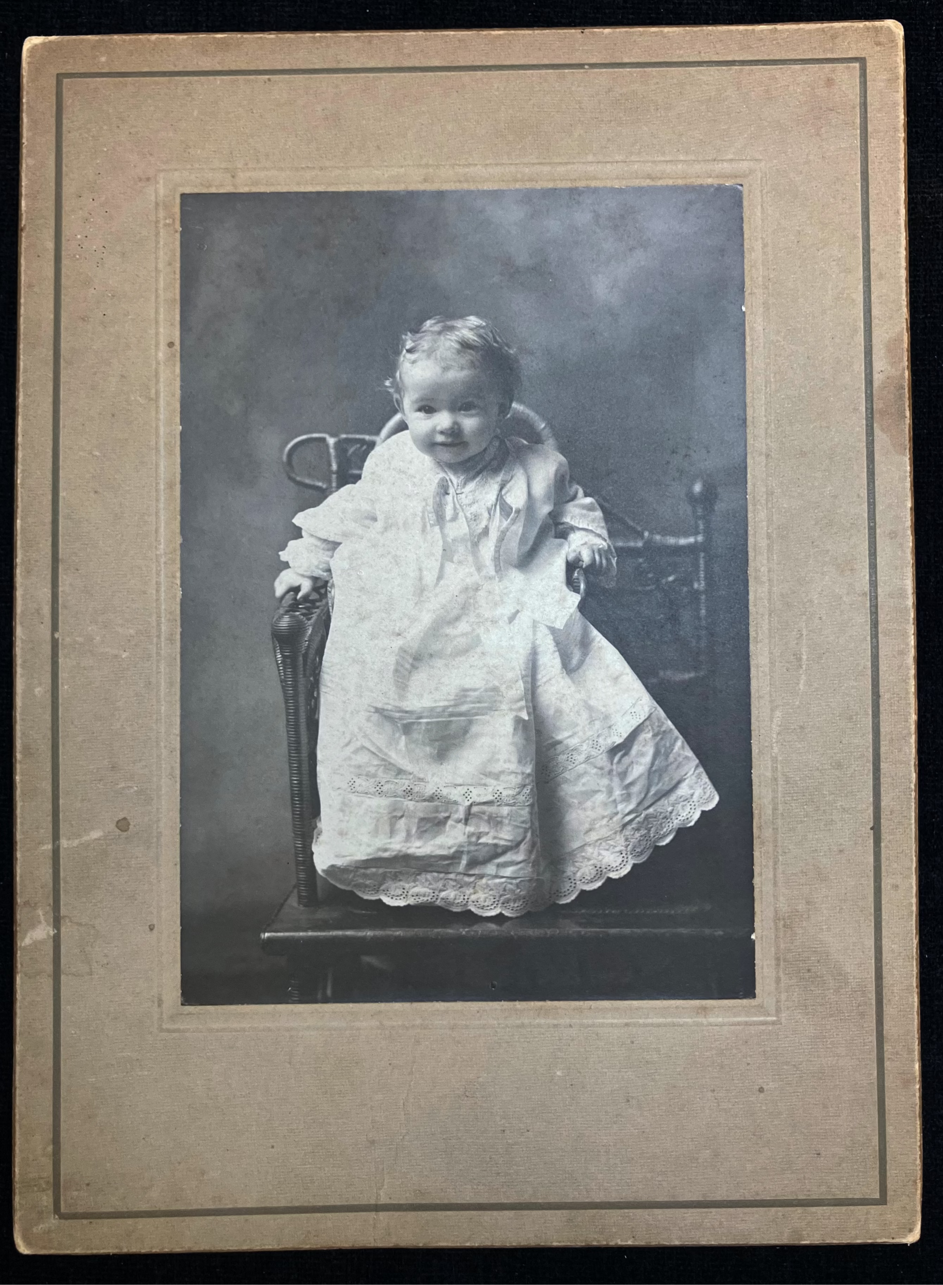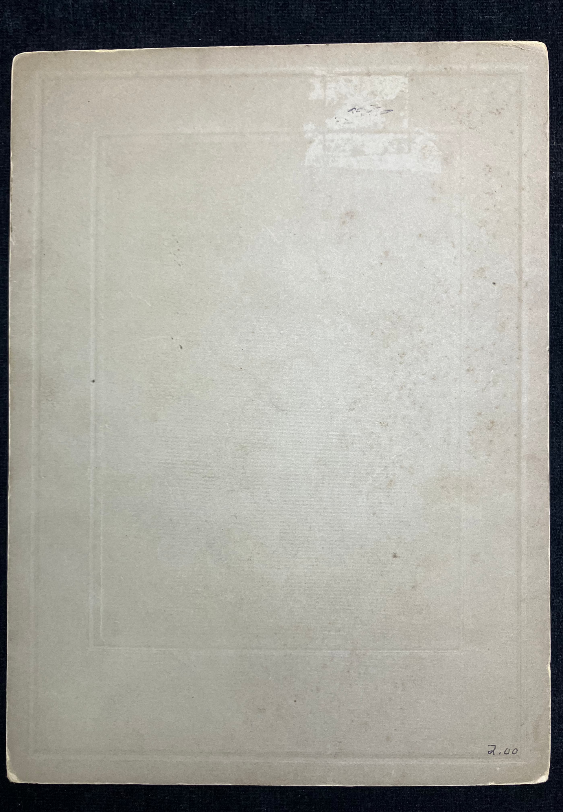 This card is a unique size indicative of early 20th century developments in photography, at just over 8 inches tall and 6 inches wide. The photograph, too, is larger than normal cabinet cards, meaning the family likely paid more for a custom photo.