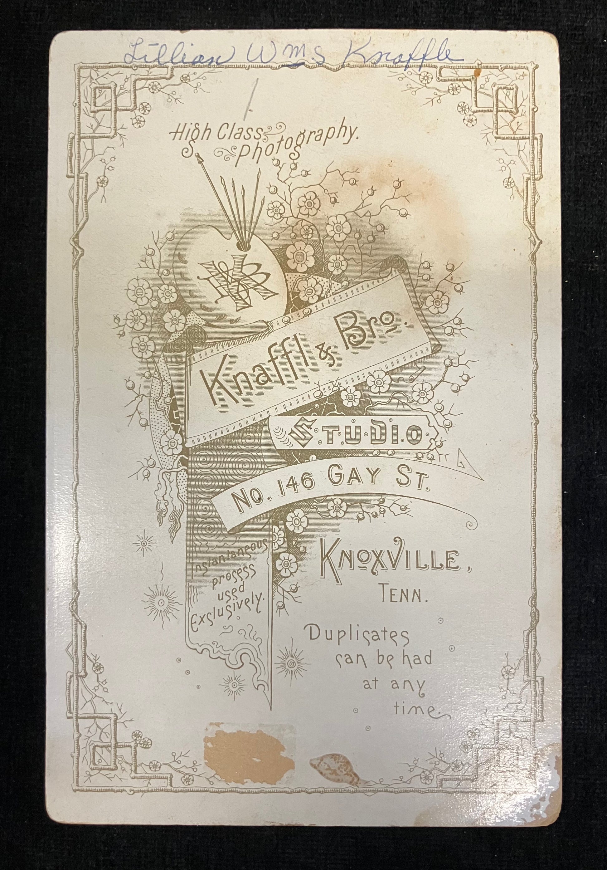 Joseph Knaffl, of Austrian origin, opened a studio in Knoxville, TN, with his brother Charles in 1884 and opened another in 1909. His style was heavily influenced by classical art, and his most famous photograph is the award-winning "Knaffl's Madonna". The Knaffl + Bro. studio offered high-class photography of Knoxville elite and advertised their "instantaneous process" of photography along with a unique dual-lighting technique.