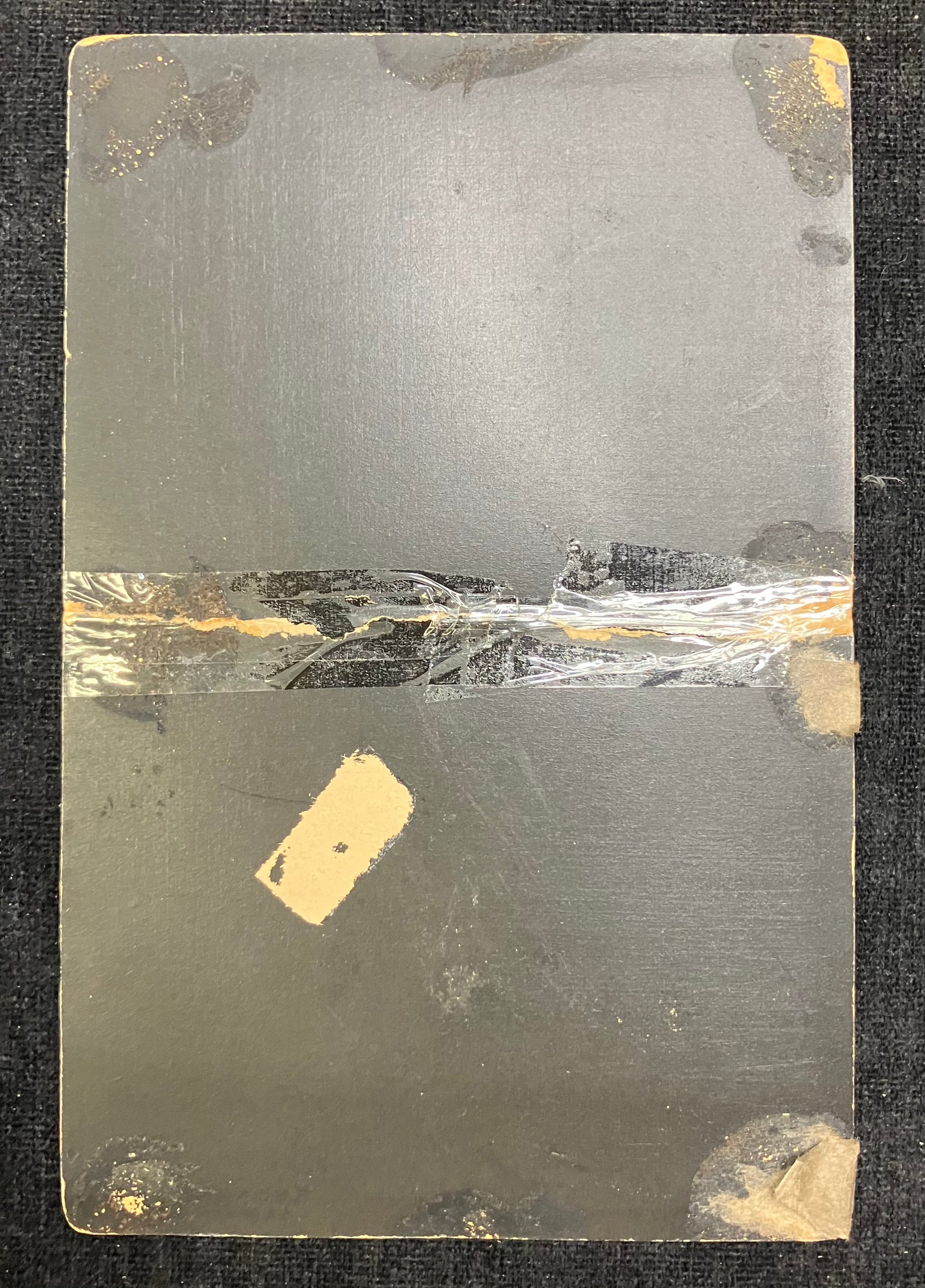 Condition: Mild peeling and discoloration at the corners, with a crack running down the middle of the back, taped by a previous owner. The crack is hardly visible in the busy photo. Adhesive residue from previous mounting.
