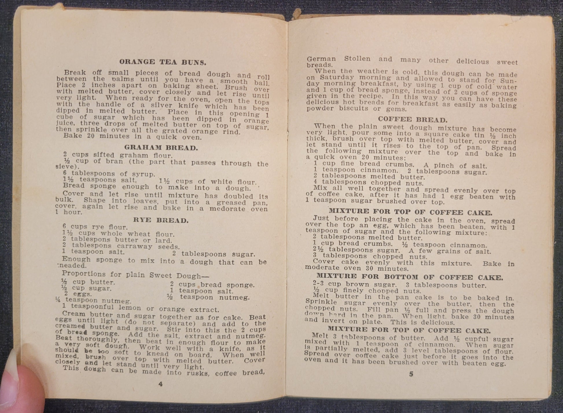 This Promotional or advertising booklet contains recipes from yeast starter to egg white frosting and includes a set of sewing needles attached to the inside front cover. The staples have started rusting a bit and the edges have worn with age. The sewing needles show age, and the title page has foxing. The inside pages are in excellent condition given their age. The cover has some creasing as can be seen in the pictures.