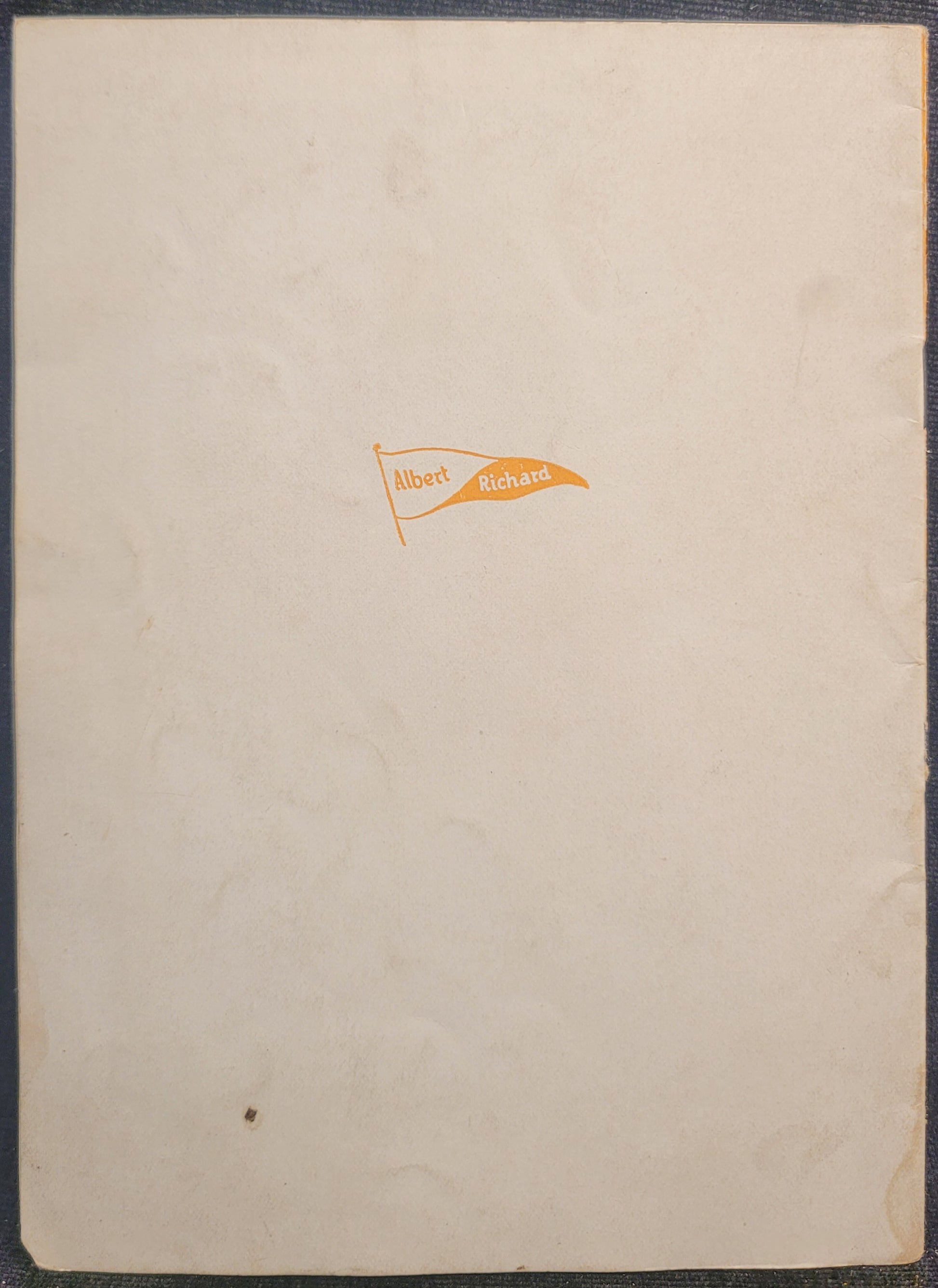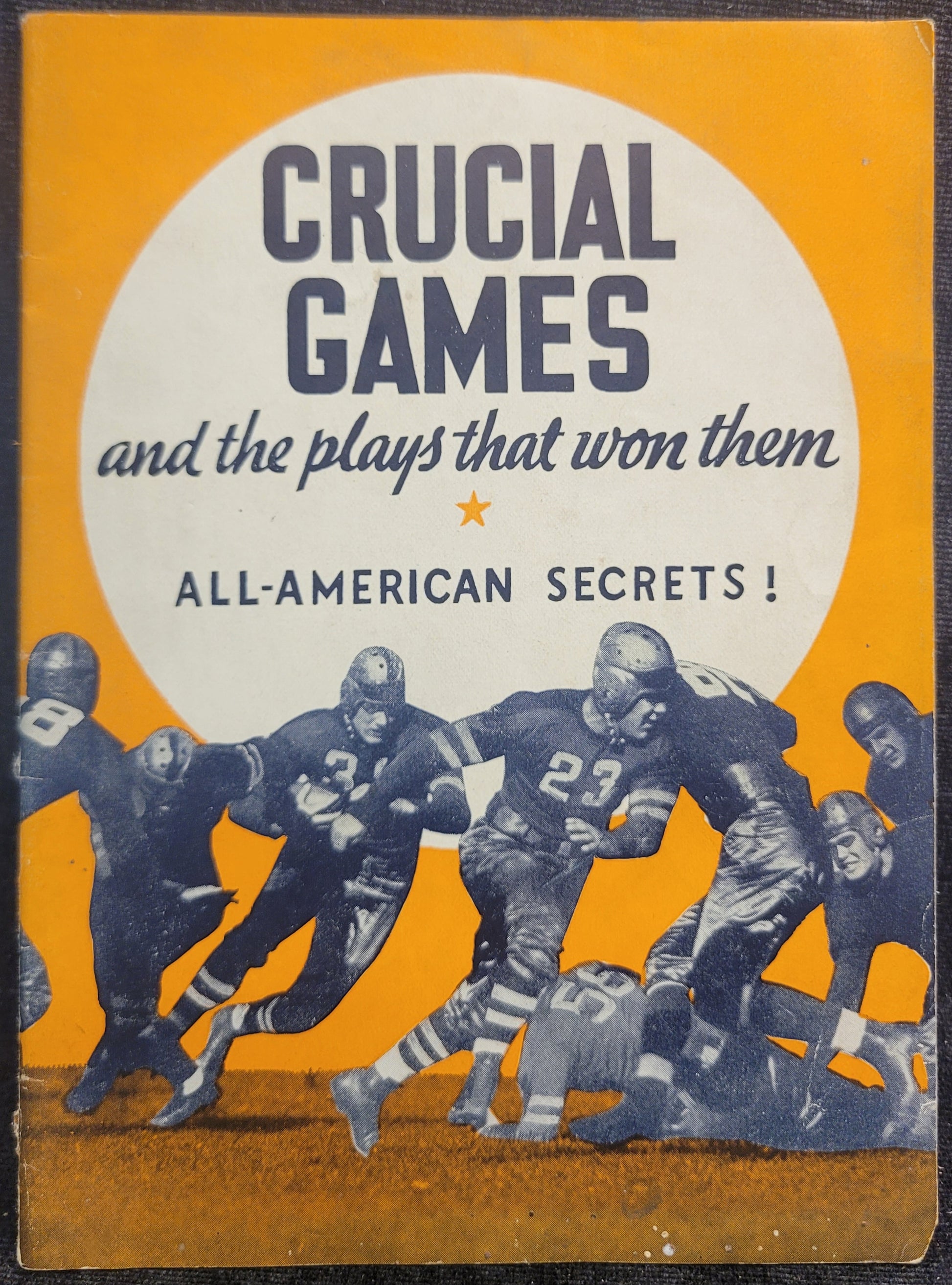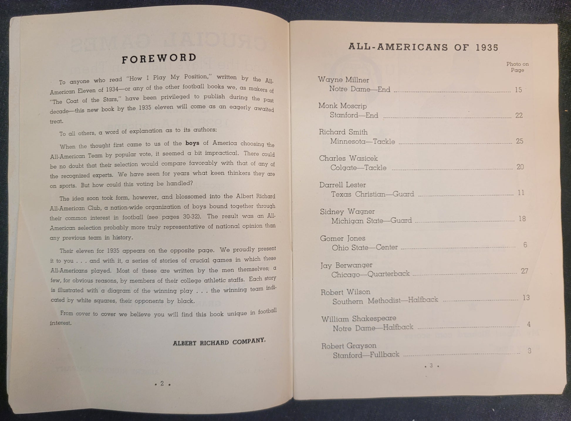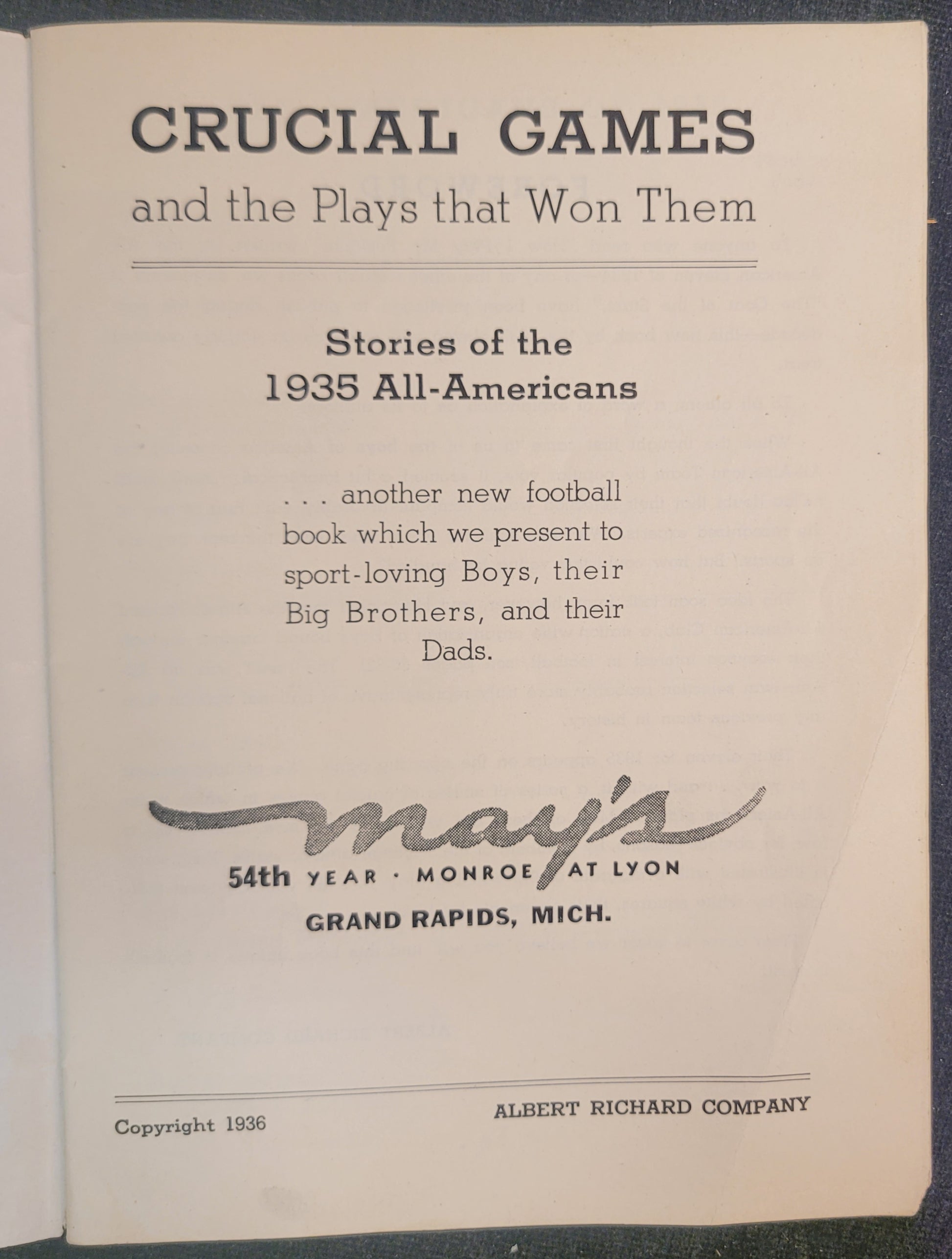 This booklet details some of the most important games during the 1935 football season, and what the players and coaches did to win them. It was published by the Albert Richard company in 1936. The company started as a division of the Fried-Ostermann Company, a glove manufacturer, of Milwaukee, Wisconsin. Albert Richard produced leather and sportswear and quickly outgrew Fried-Ostermann. The company was eventually sold in the mid 1950s.